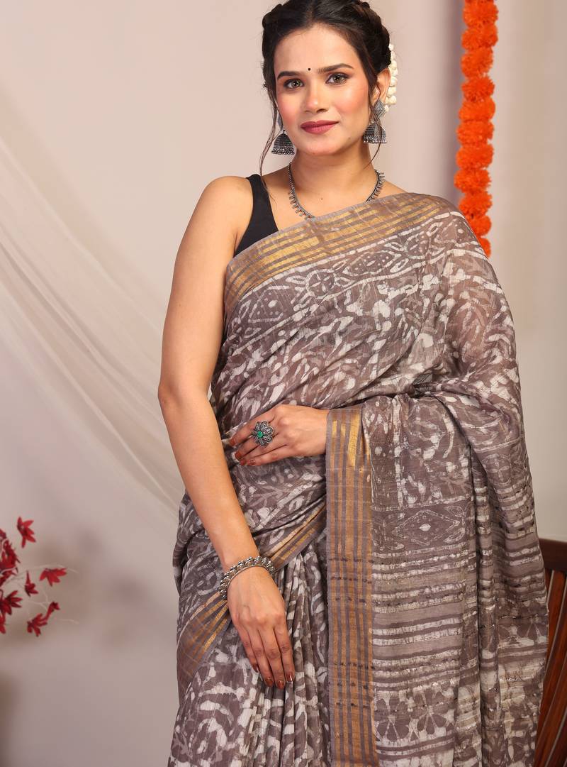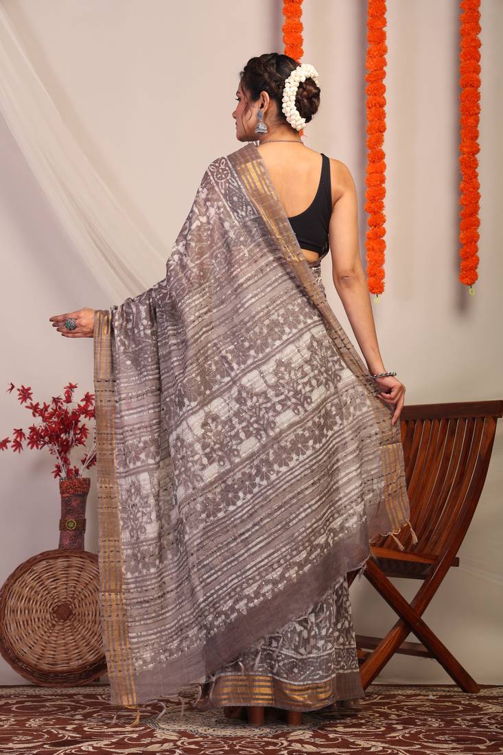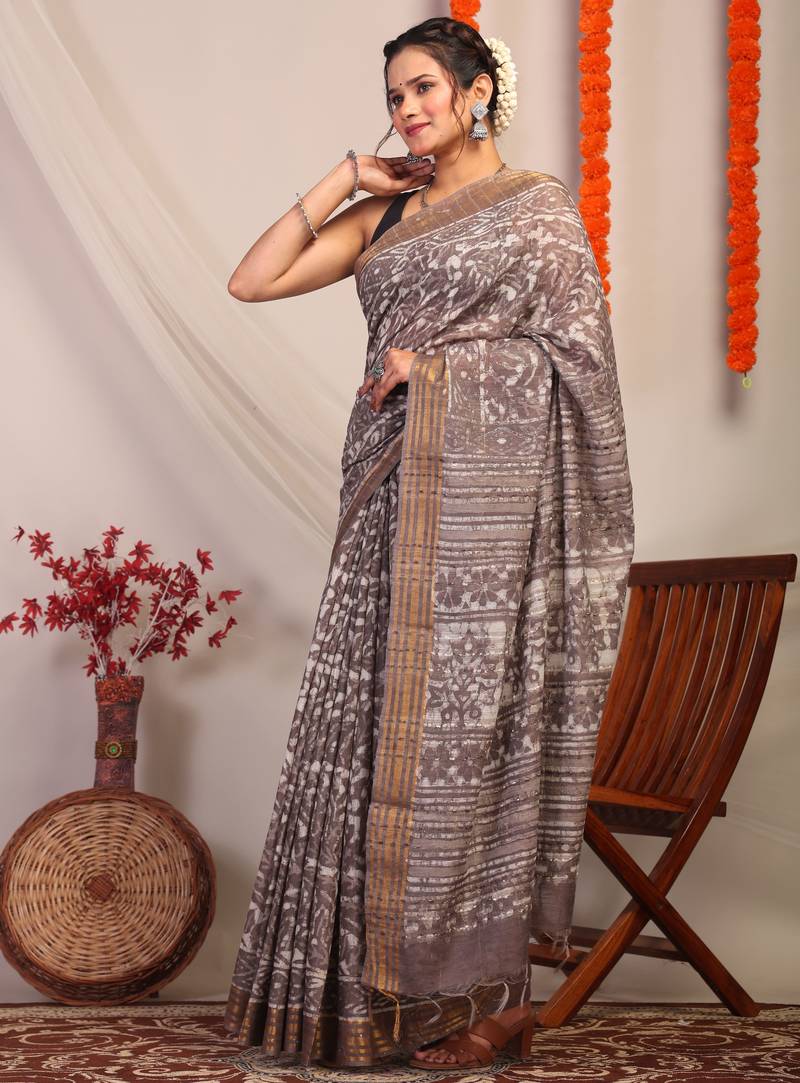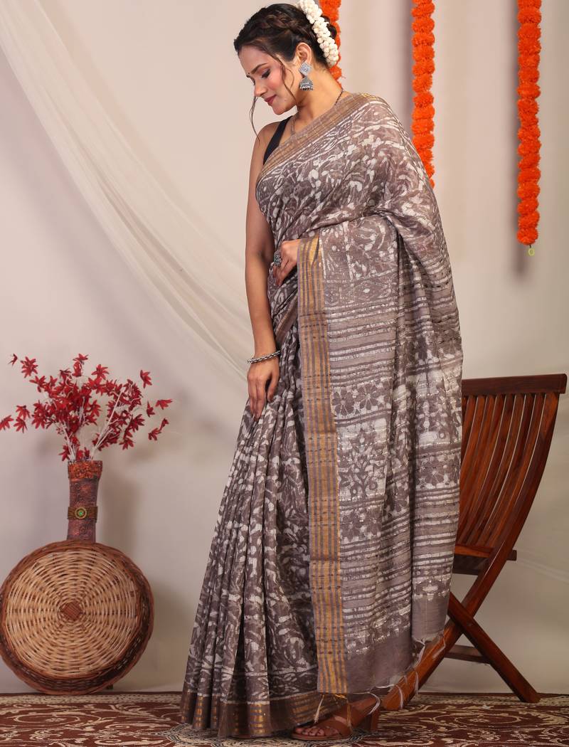 | Product Description | Command Attention With The Understated Glamour Of Our Brown Bhagalpuri Cotton Silk Saree. Designed For The Modern Muse With A Love For Tradition, This Statement Piece Features Bold Hand Block Florals That Bring Texture And Character To Its Earthy Base. Playful Frills, Rich Zari Detailing, And A Luxe Golden Border Elevate The Look With Festive Flair. |