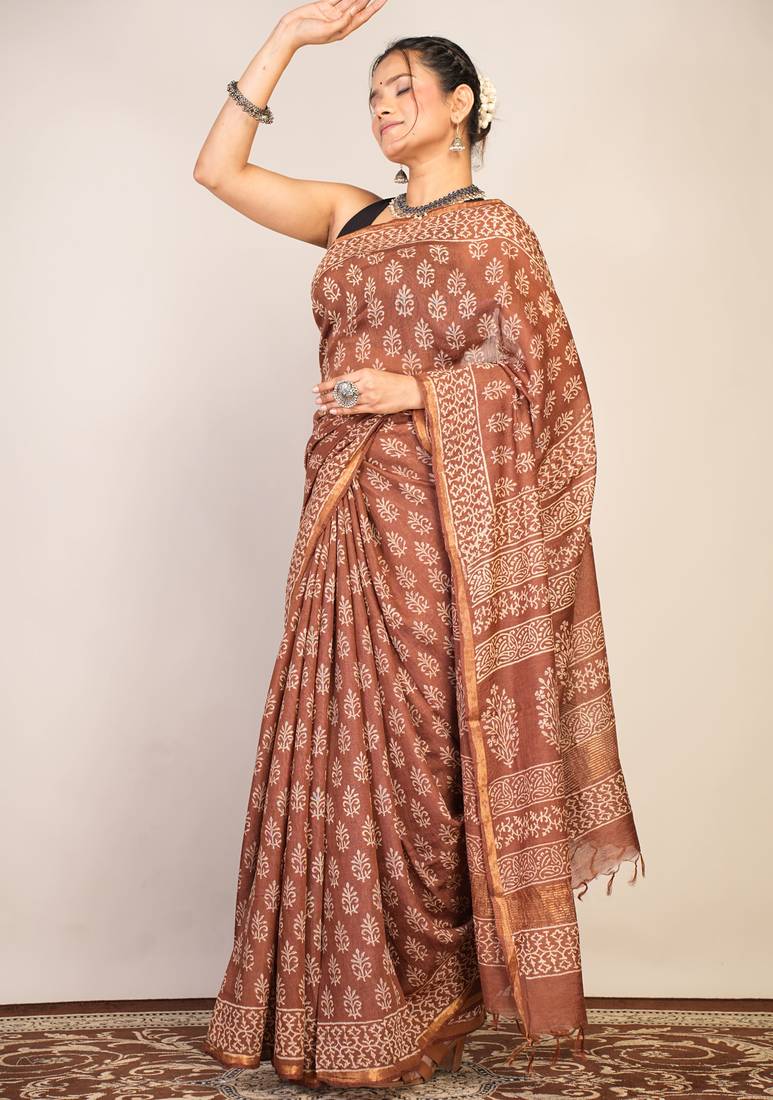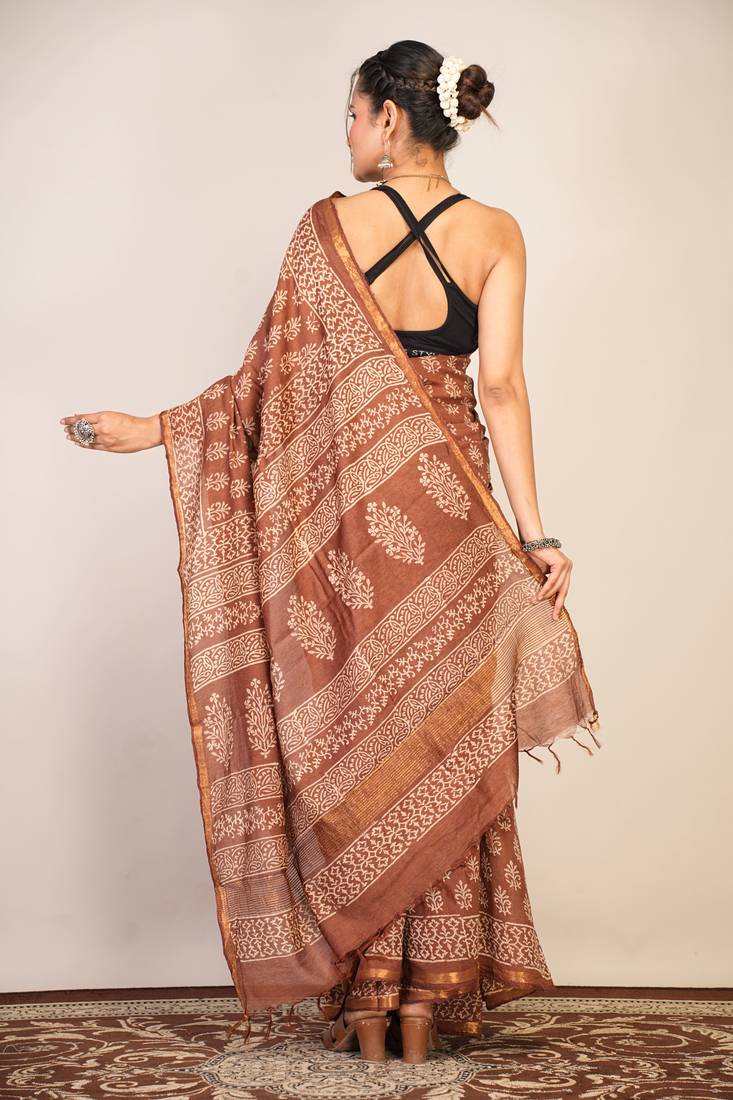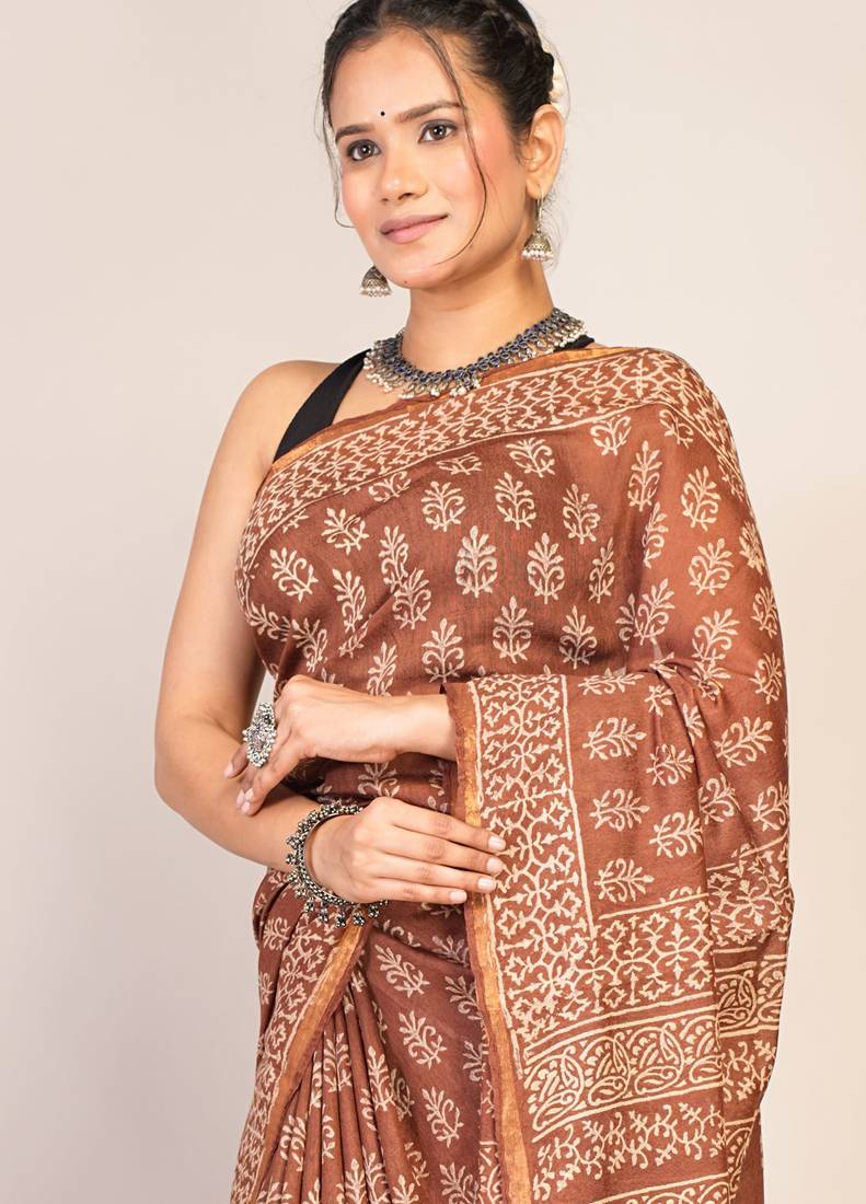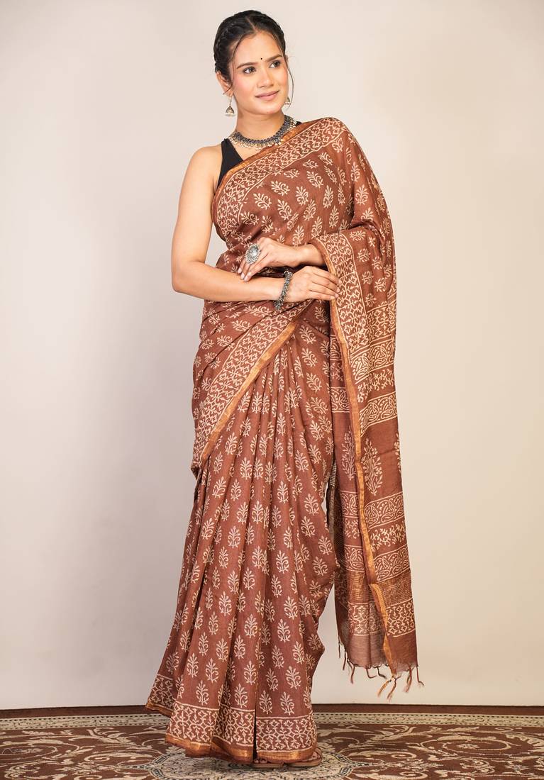 | Product Description | Soft, Breathable, And Gracefully Flowing, This Saree Is Designed To Drape You In Effortless Charm.The Rich, Earthy Brown Shade Brings Warmth And Sophistication, Perfectly Enhanced By Delicate Floral Hand Block Prints That Celebrate Artisanal Heritage. A Slender Golden Zari Border Adds A Touch Of Festive Brilliance, While Intricate Zari Embellishments And Playful Tassels Complete The Look With Subtle Sparkle. |