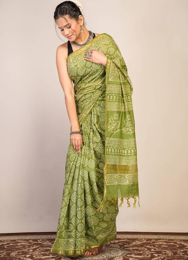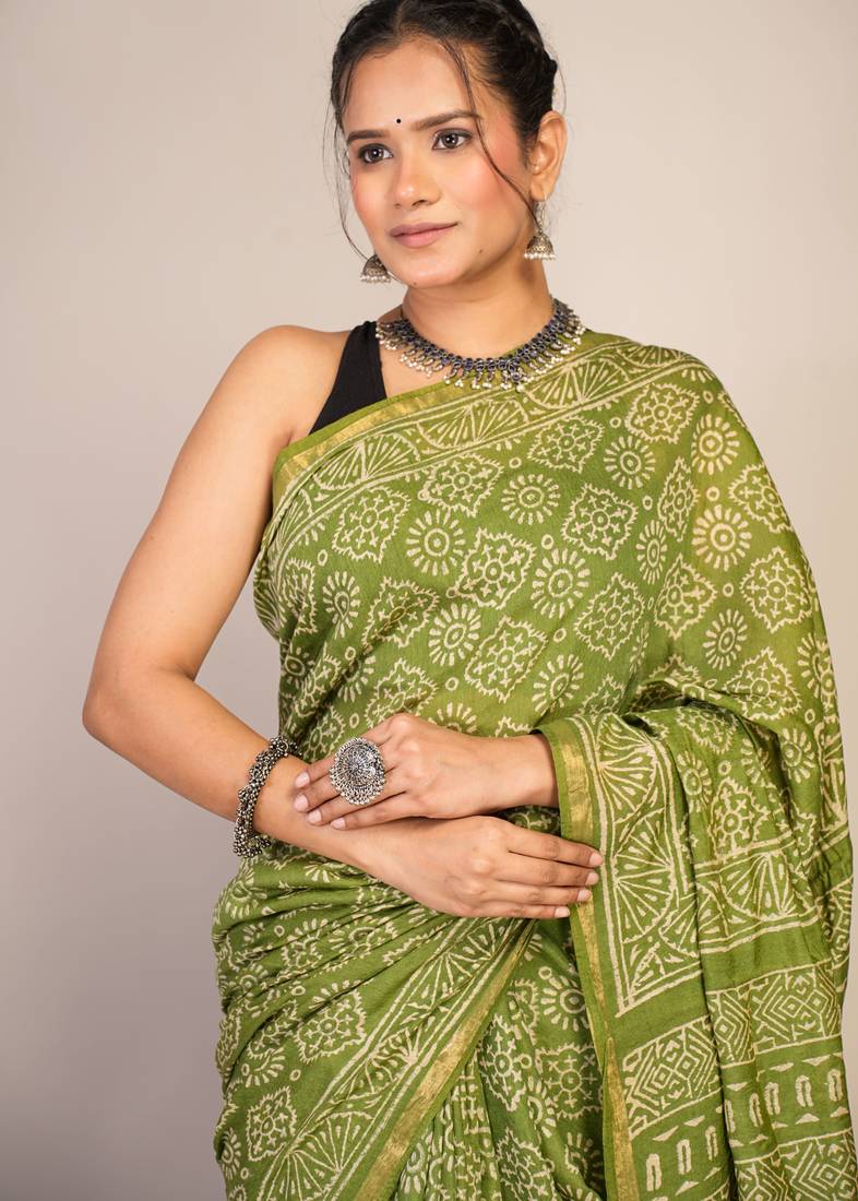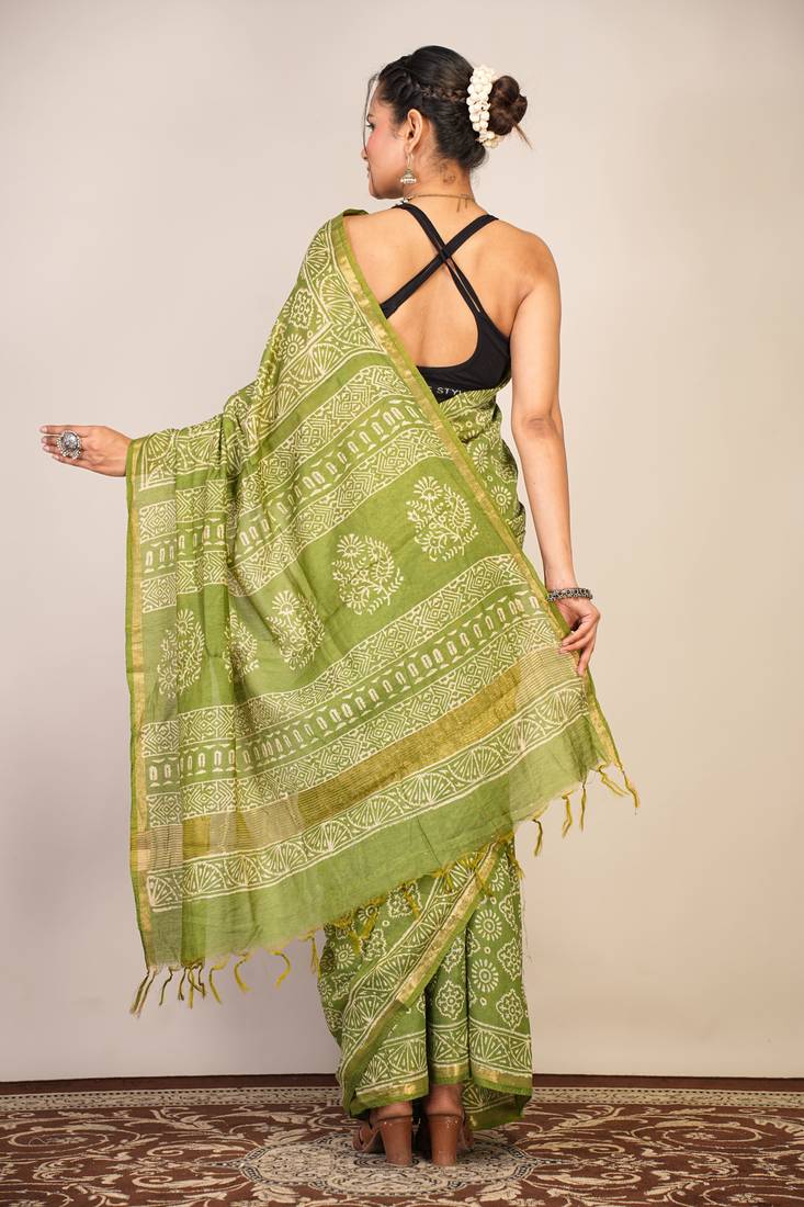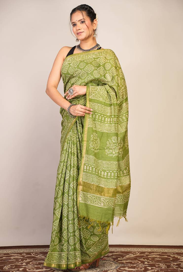 | Product Description | The Rich Green Hue Stands Out Effortlessly—Elegant, Vibrant, And Unique. Adorned With Hand Block Abstract Prints, This Saree Brings A Modern Edge To A Classic Silhouette.The Golden Zari Border Adds The Perfect Hint Of Festive Sparkle, While Delicate Embellishments And Fancy Tassels Give It That Luxe Finish You've Been Searching For. Whether You're Attending A Wedding, Festival, Or Celebration, This Saree Ensures All Eyes Are On You. |