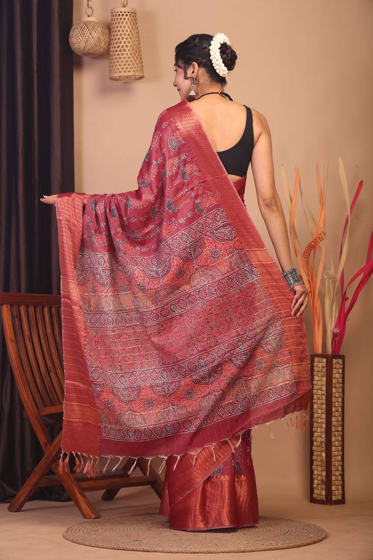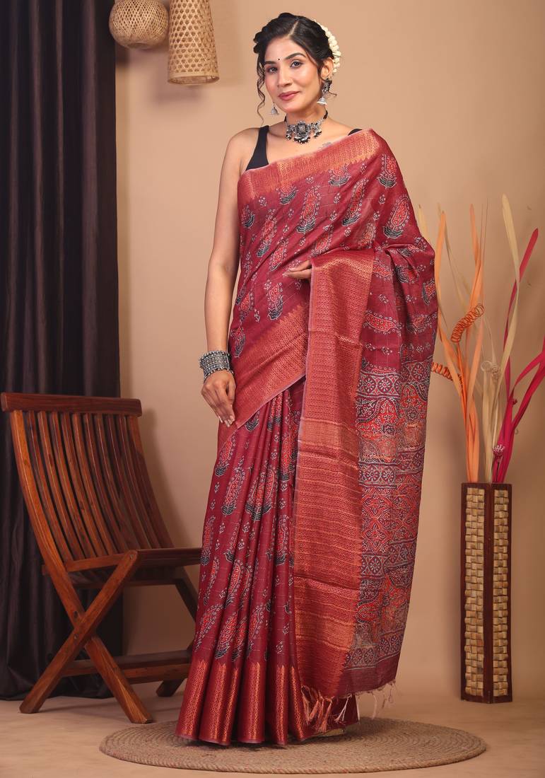 | Product Description | Step Into A World Of Regal Elegance With Our Mehroon Bhagalpuri Cotton Silk Saree — A Stunning Fusion Of Traditional Artistry And Modern Grace. The Rich Mehroon Hue Speaks Of Timeless Sophistication, While Intricate Hand Block Floral Prints, Delicate Frills, And Gleaming Zari Work Elevate Its Charm. Accented With A Grand Dabu Style Thick Gold Border, This Saree Is Made To Dazzle At Weddings, Festivals, And All Your Special Moments. |