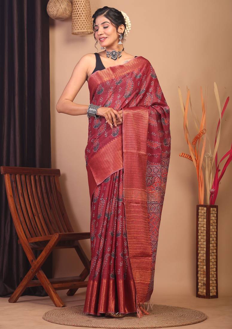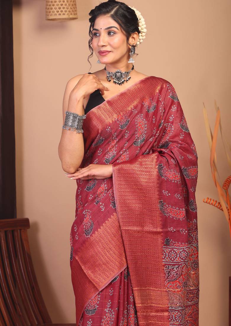 Mehroon zari work, dabu embroidery cotton silk blend bhagalpuri ethnic saree with unstitched blouse