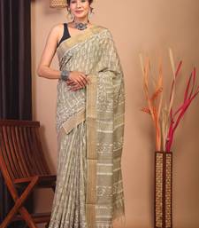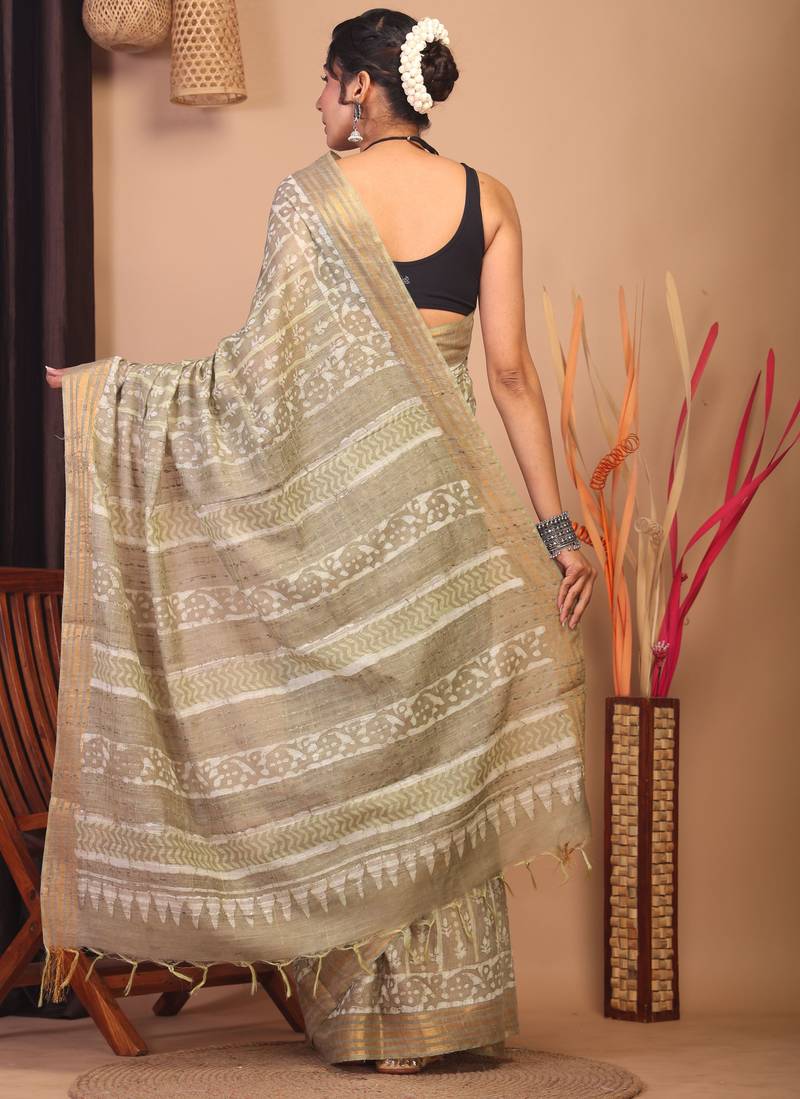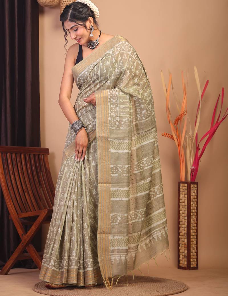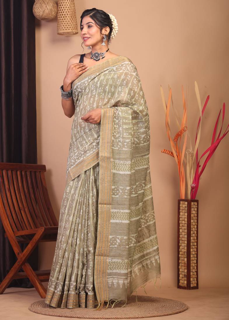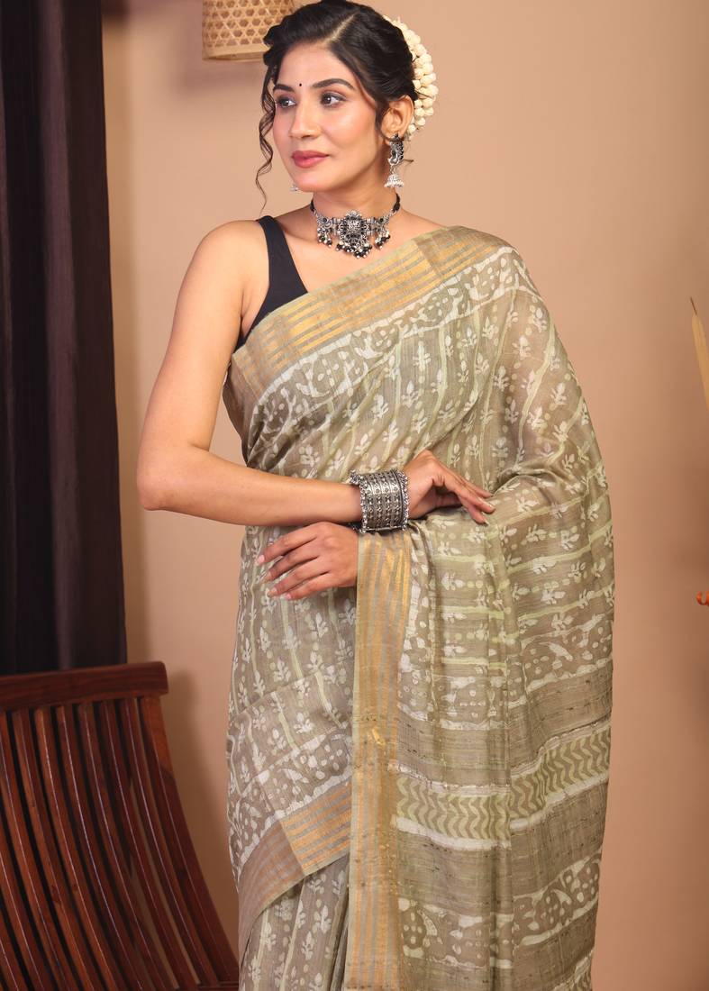 Olive green zari work cotton silk blend bhagalpuri ethnic saree with unstitched blouse