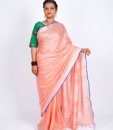 Peach embellished cotton linen bhagalpuri ethnic saree with unstitched blouse