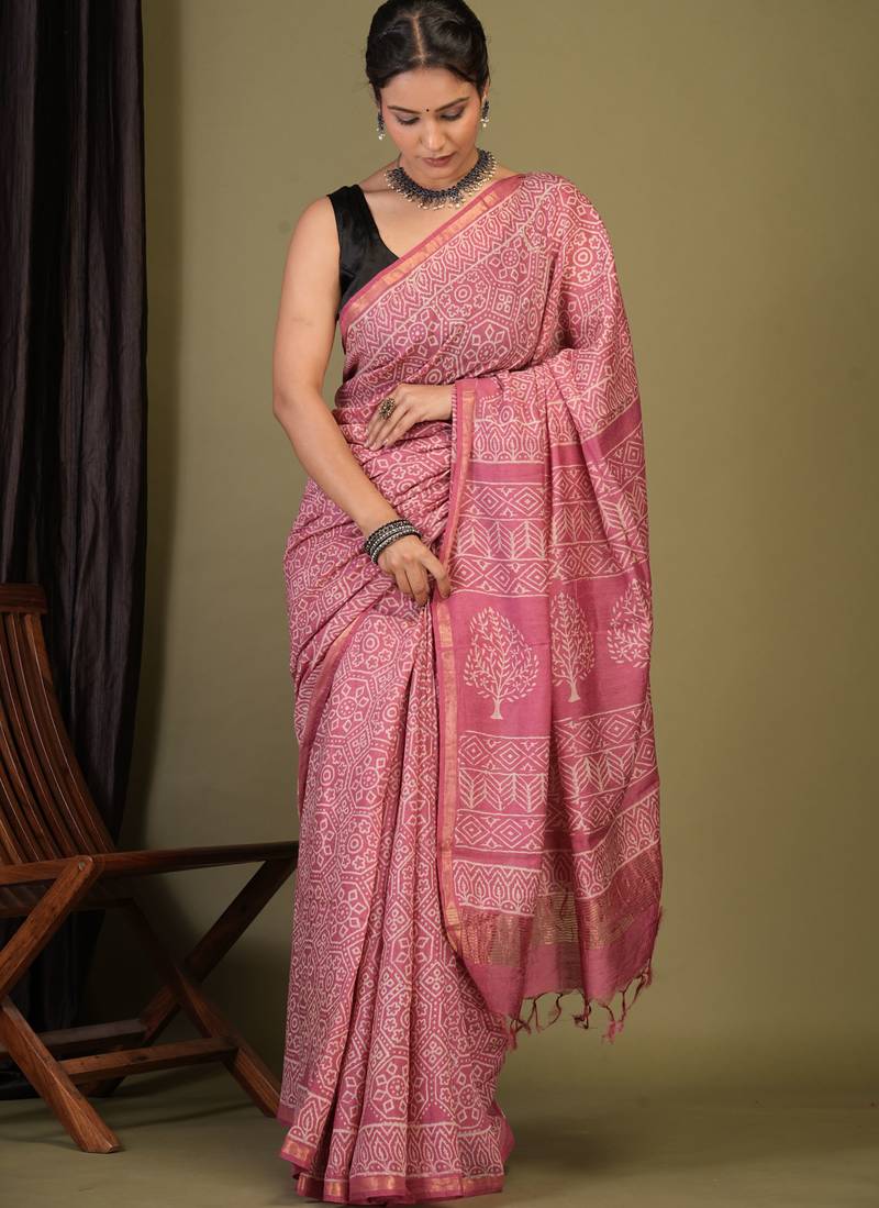 | Product Name | Pink Zari Work, Tassle Cotton Silk Blend Bhagalpuri Ethnic Saree With Unstitched Blouse | |