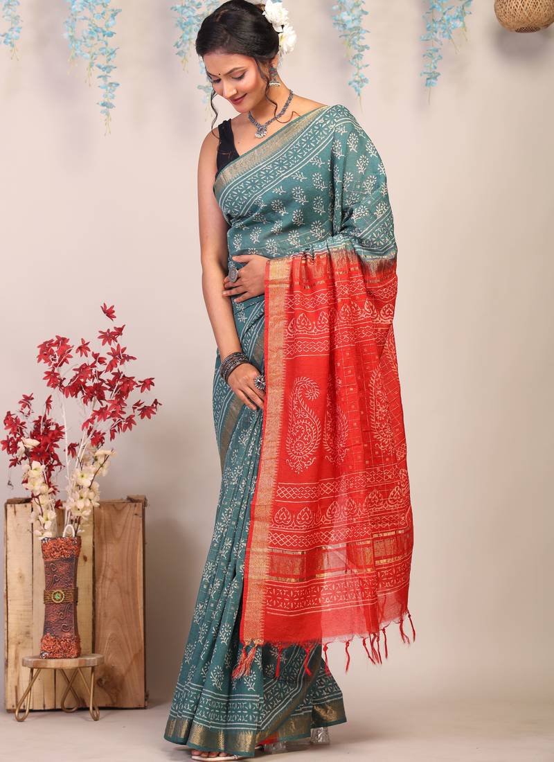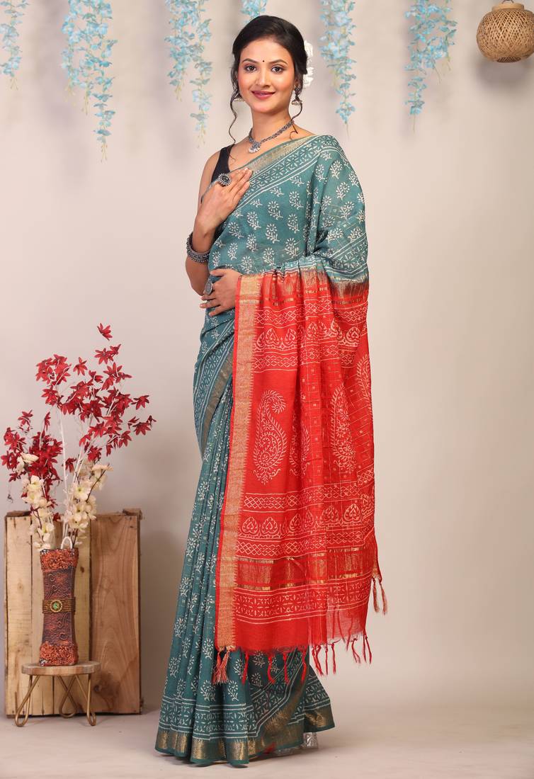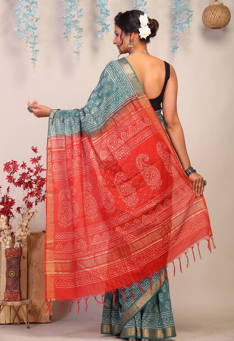 Teal green & red zari work cotton silk blend bhagalpuri ethnic saree with unstitched blouse