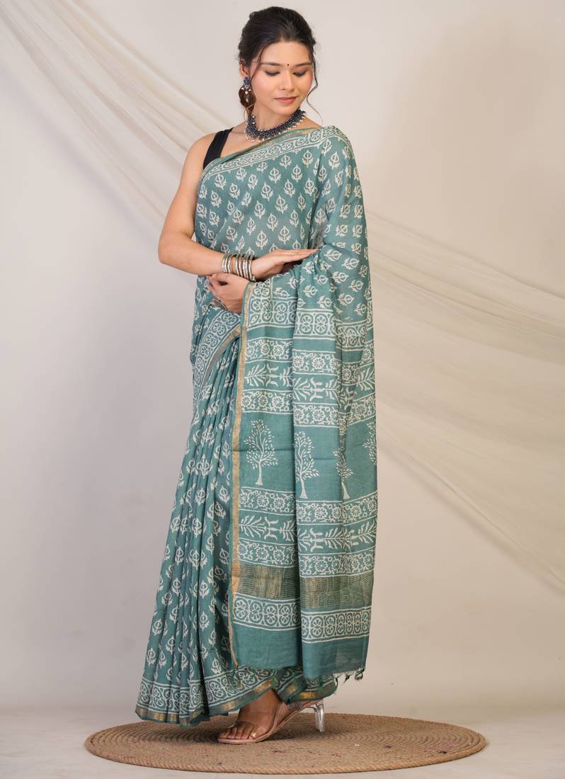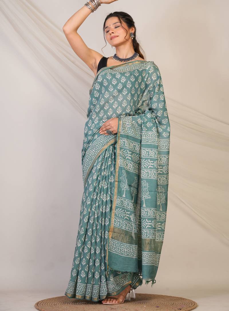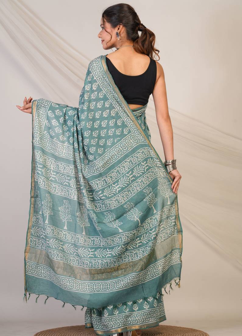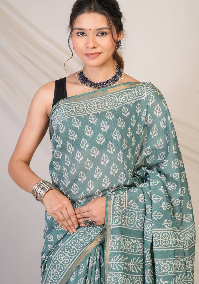 | Product Description | This Saree Offers A Soft, Fluid Drape That’s Both Graceful And Comfortable—Perfect For Festive Days And Grand Evenings.The Deep Teal Green Hue Exudes Calm Sophistication, While The Hand Block Abstract Prints Add A Unique, Contemporary Touch To Its Ethnic Roots. A Thin Golden Zari Border Lines The Saree With Subtle Shimmer, Beautifully Complemented By Delicate Zari Embellishments And Playful Tassels For That Extra Touch Of Charm. |