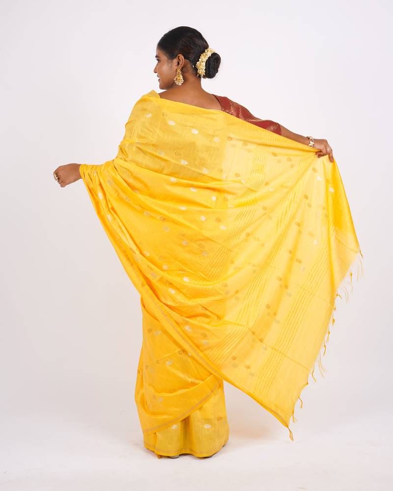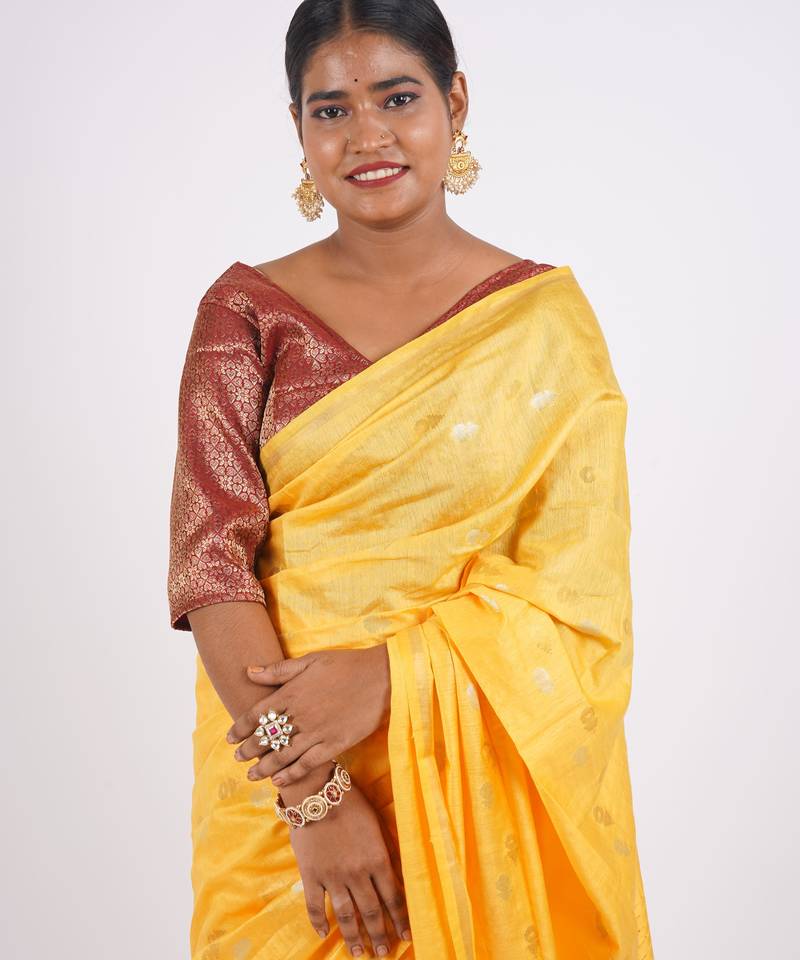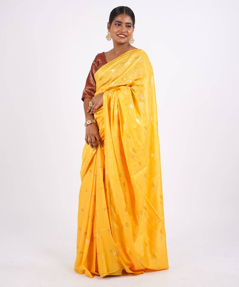 | Product Description | Bring Festive Radiance To Your Wardrobe With This Anuttara Women’s Bhagalpuri Cotton Silk Saree In A Cheerful Yellow Shade. Featuring Zari Buta Motifs, Delicate Embellishments, And Sparkling Sequins, This Saree Is A Perfect Mix Of Tradition And Festive Glam. The Frill Styling Adds A Modern Twist To Its Ethnic Look, Making It A Must Have For Weddings And Special Occasions.Crafted From Premium Cotton Silk, This Saree Offers A Smooth Texture, Lightweight Comfort, And An Elegant Drape. |