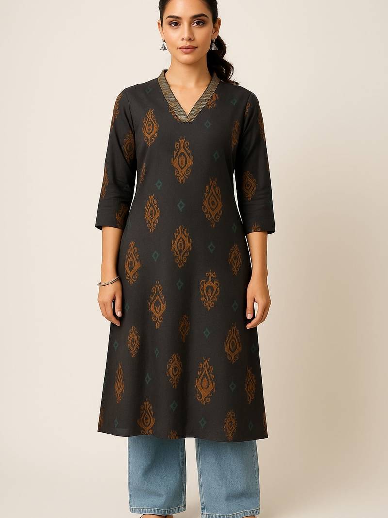 | Product Name | Black Color Block Style Print With Zari Couching On Neckline Kurti | |