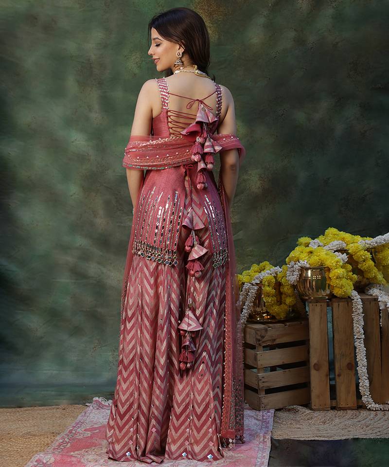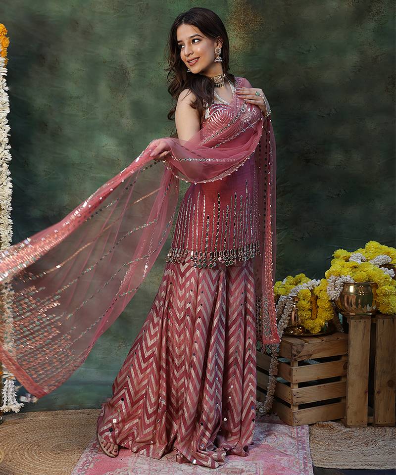 | Product Description | A Graceful Pink Sharara Set In Lustrous Raw Silk, Enhanced With Delicate Embroidery For A Refined Ethnic Appeal. The Flattering Flare And Soft Sheen Bring Festive Charm, Making It Perfect For Wedding Functions, Family Celebrations, And Stylish Daytime Festivities.