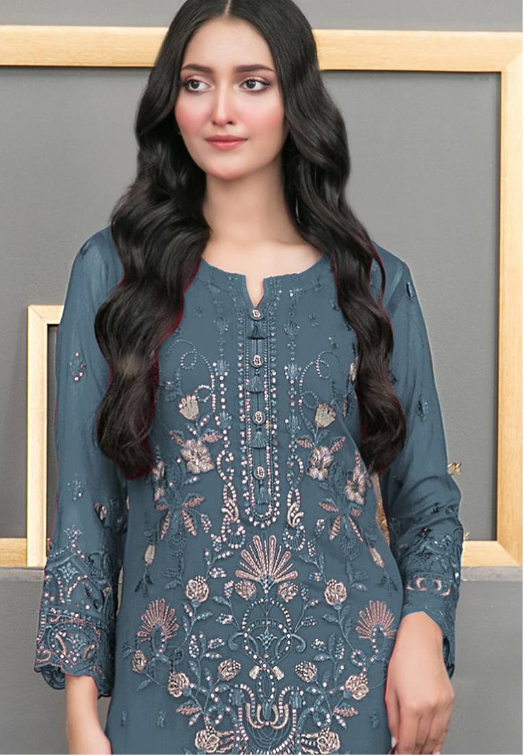 | Product Name | Dark Aqua Blue Color Embroideried Faux Georgette Semi Stitched Salwar Suit | |