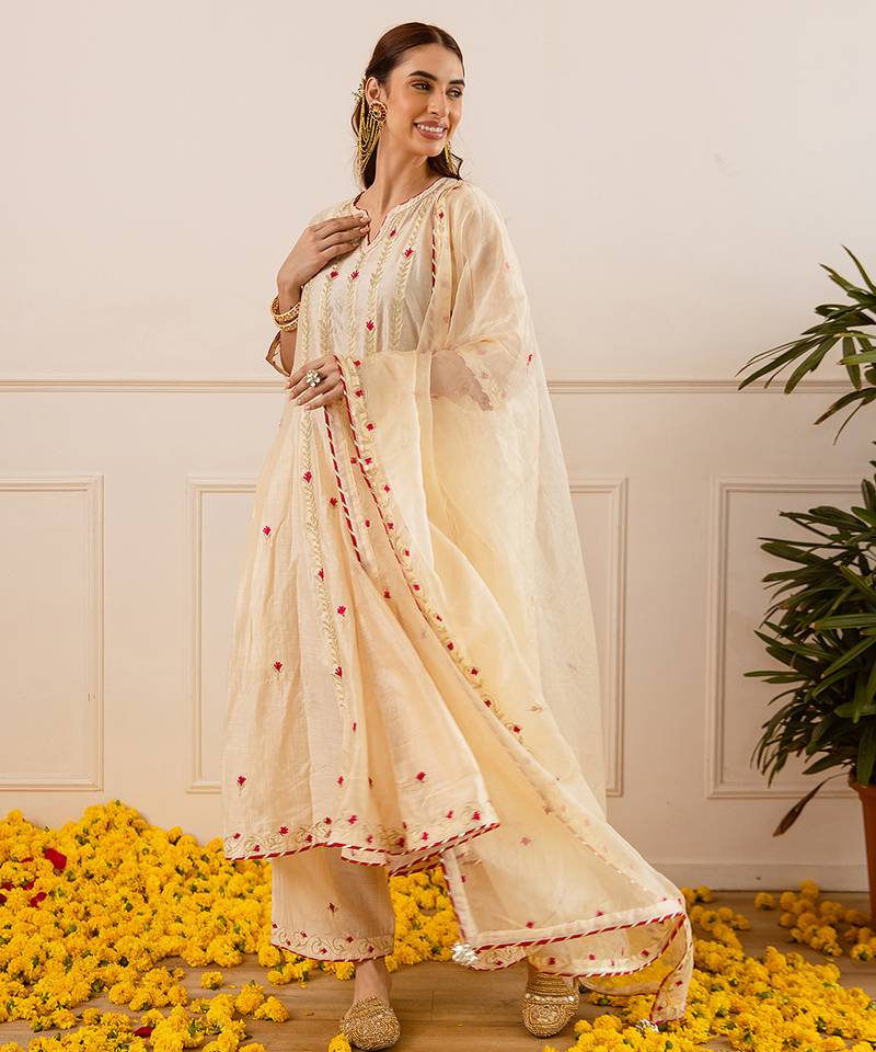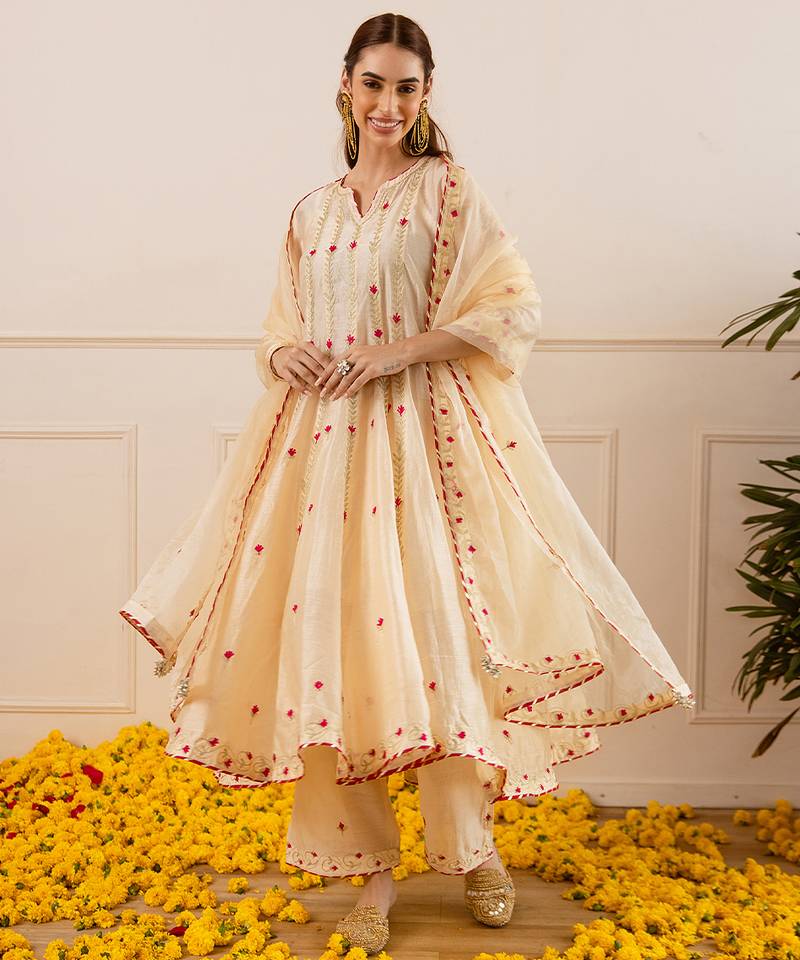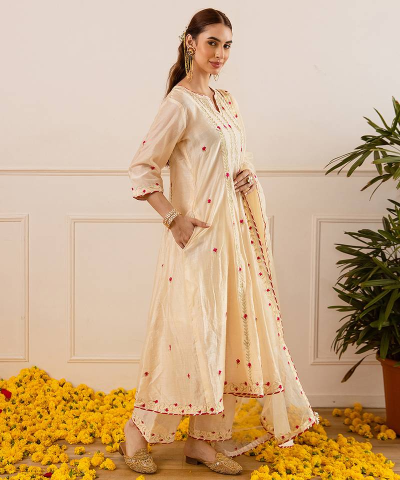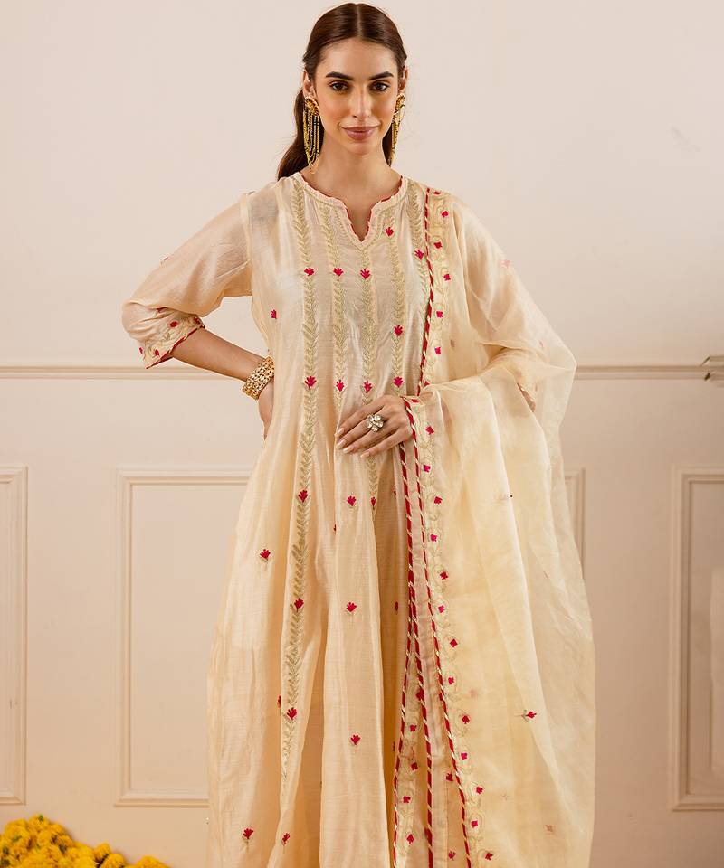 | Product Description | An Elegant Ivory Chanderi Anarkali Showcasing Subtle Sheen, Enriched With Uniform Zari Work Across The Kurta And Highlighted By Pink Flower Aari Sprigs That Add Contrast And Definition. A Lightweight Organza Dupatta Mirrors The Kurta’s Embroidery Pattern With Matching Pink Aari Florals And Zari Lined Borders, Creating A Refined, Picture Ready Ensemble