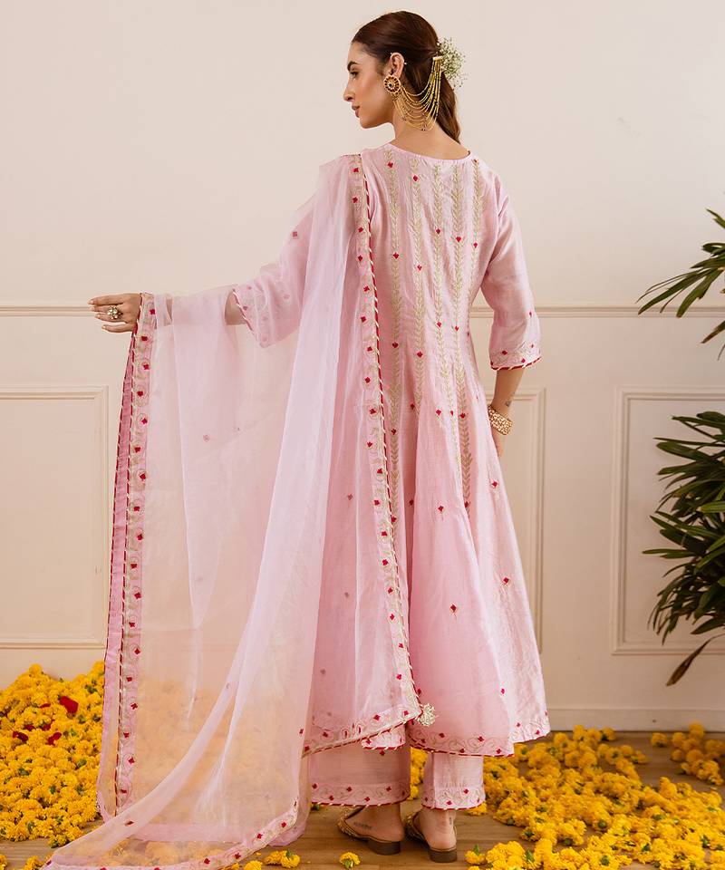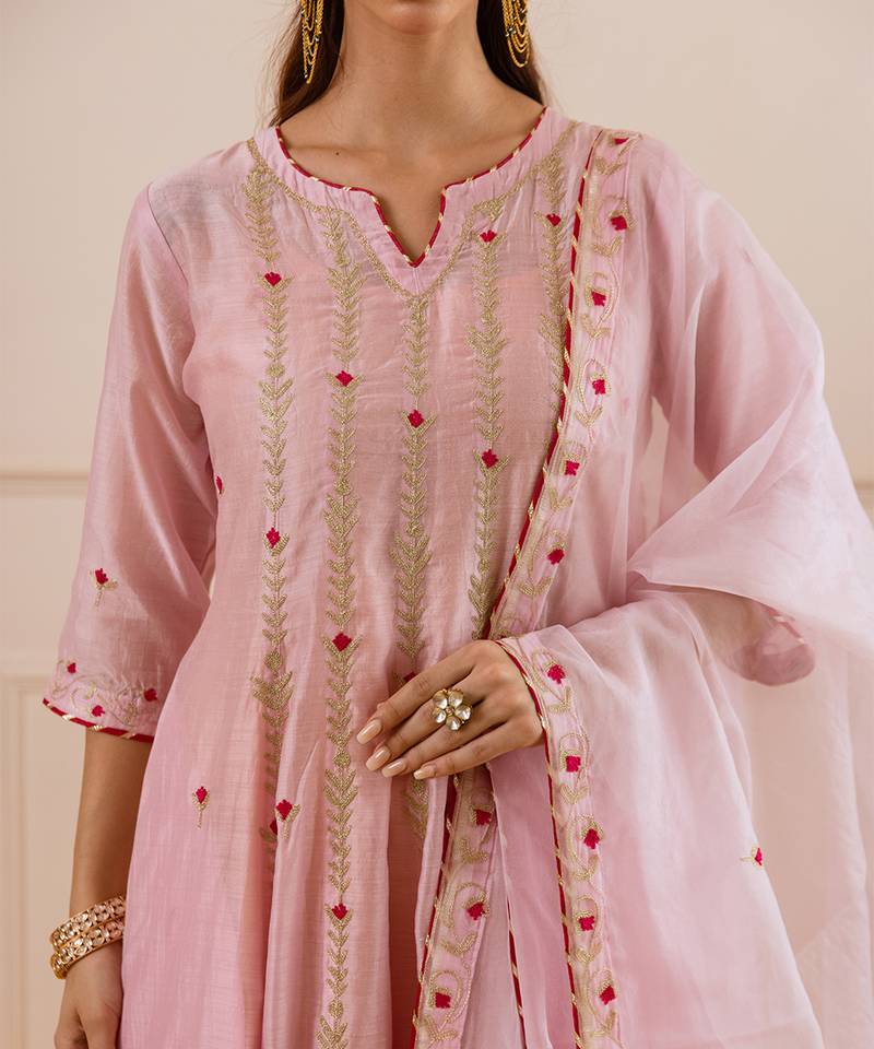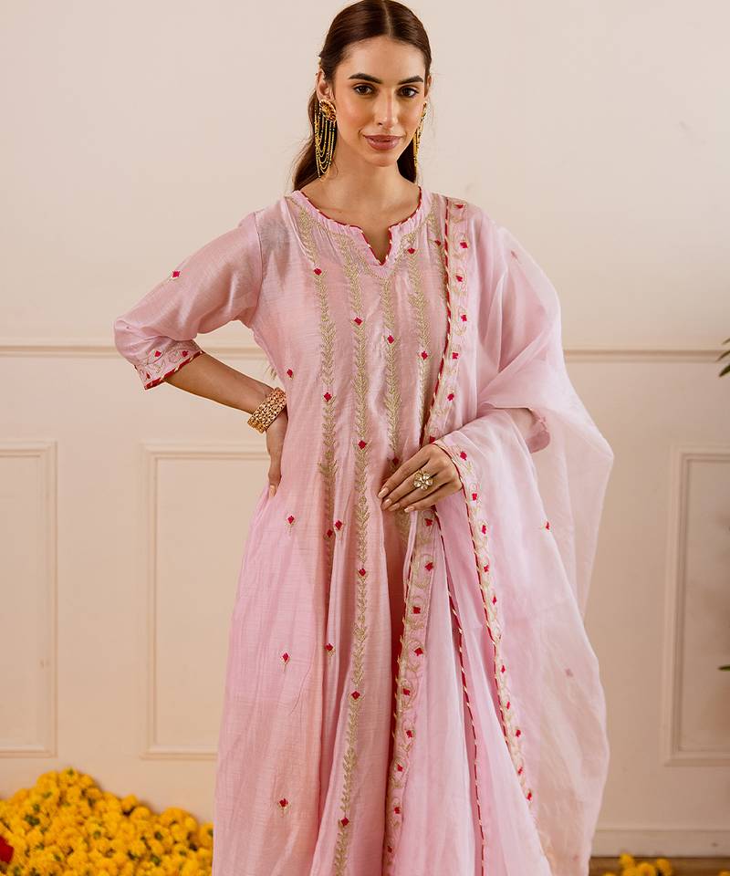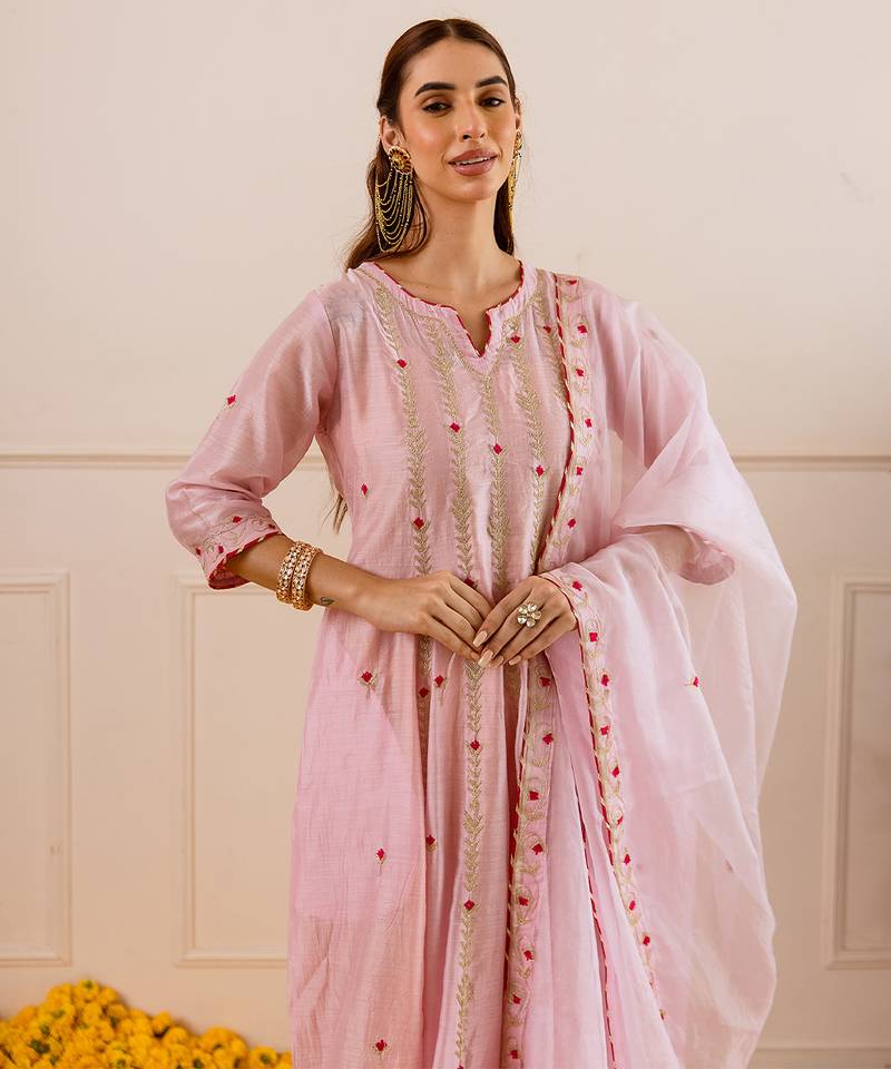 | Product Description | A Blush Pink Chanderi Anarkali With Graceful Flare, Adorned With All Over Zari Bootis And Dainty Pink Flower Aari Embroidery That Trails Along The Yoke And Panels, Balancing Shimmer With Softness. The Set Is Completed With An Organza Dupatta Finished In The Same Pink Flower Aari And Fine Zari Edging For A Cohesive, Airy Look Ideal For This Festivities.