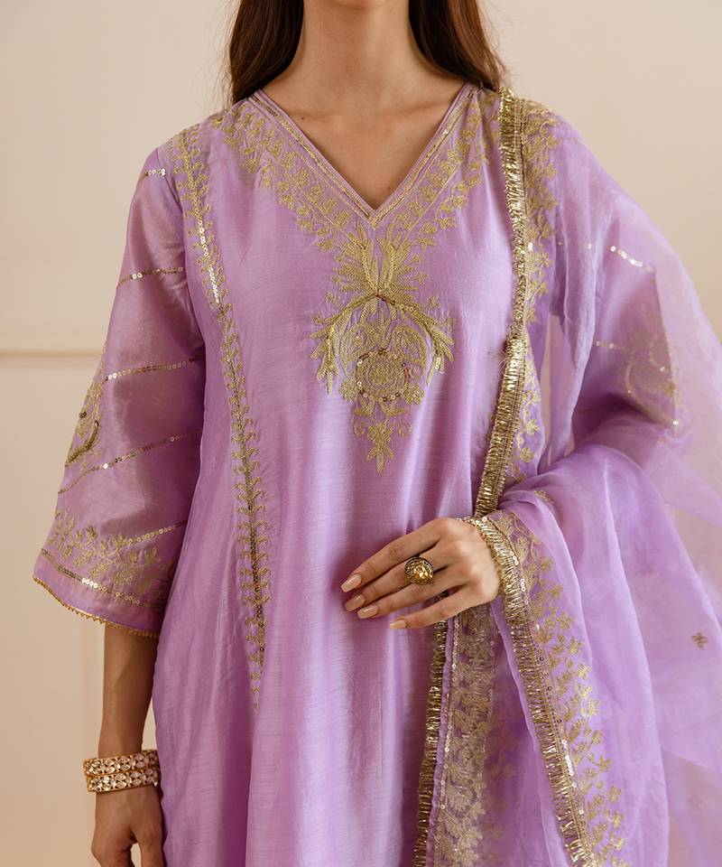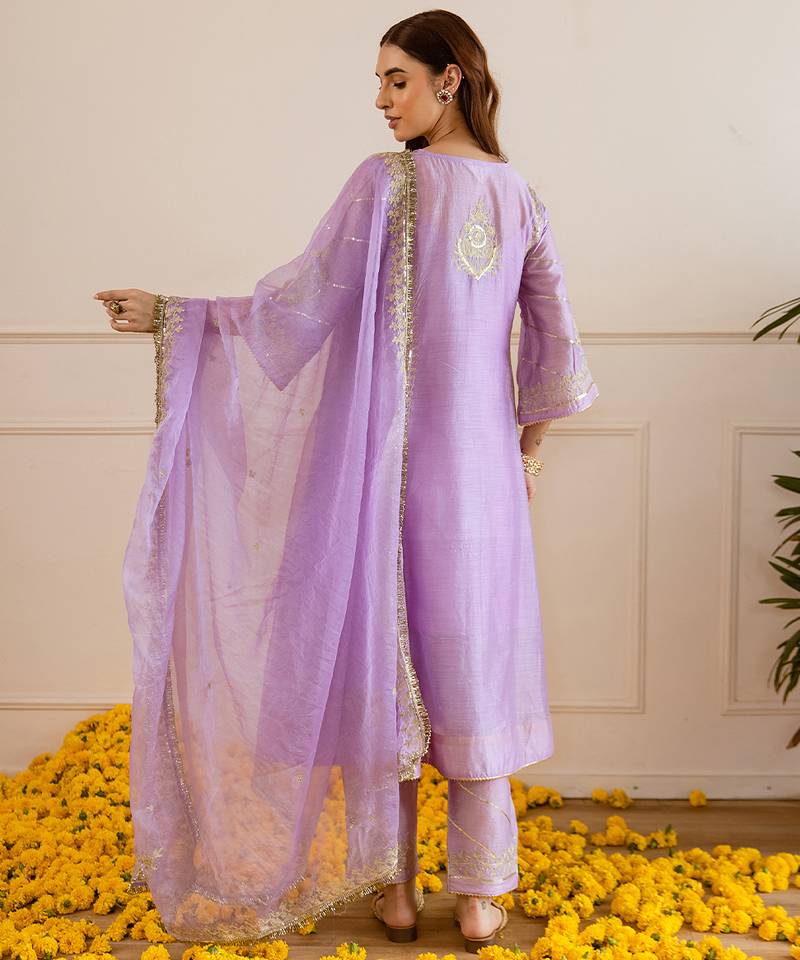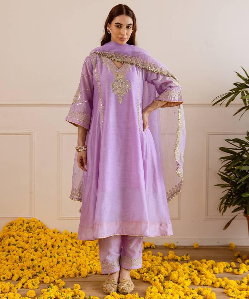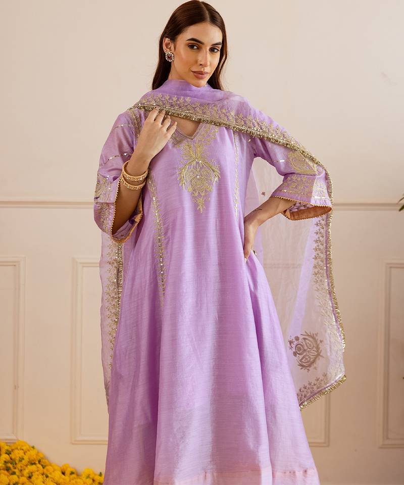 | Product Description | A Pastel Lilac Three Kali Kurta In Airy Chanderi Drapes With A Natural Sheen, Highlighted By Hand Done Zari–Tārī Motifs That Read Regal Yet Effortless For Celebrations.Paired Straight Pants Keep The Silhouette Clean, While A Sheer Organza Dupatta With Delicate Zari Edging Adds Ethereal Lightness And Festive Sparkle.