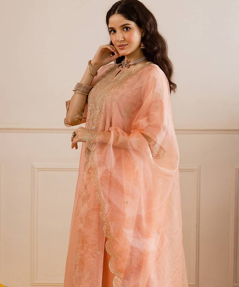 | Product Description | Soft And Graceful, This Peach Chanderi Kurta Set Is Crafted For Festive Elegance With A Touch Of Subtle Luxury. The 45 Inch Kurta Is Enhanced With Heavy Zari Work On The Neckline, Creating A Radiant Highlight Against The Delicate Base. It Is Paired With 36 Inch Pants For A Flattering And Comfortable Silhouette.