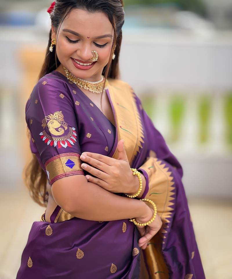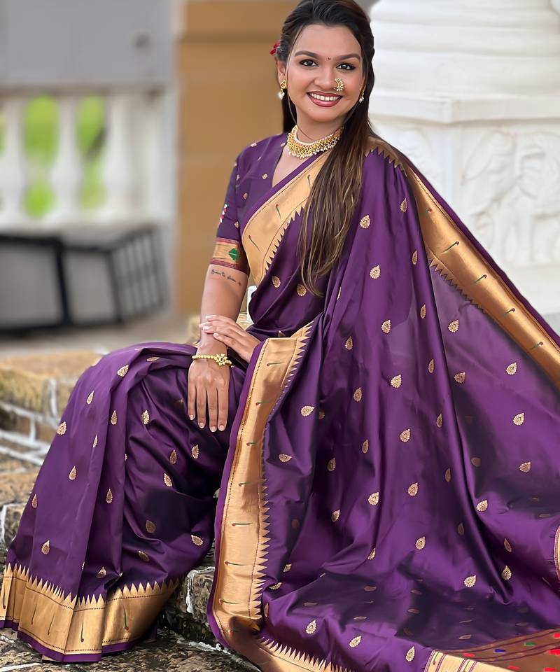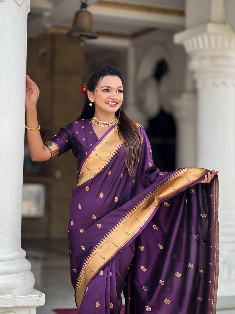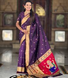 Soft paithani silk saree with zari weawing motifs design and meenakari weawing rich pallu