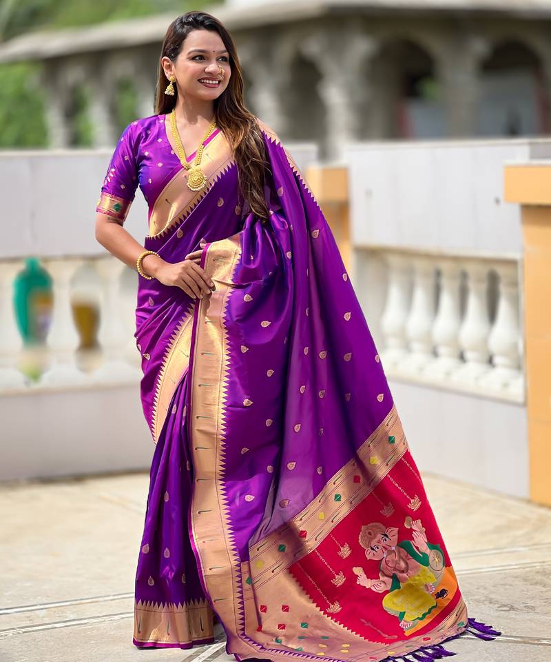 Soft paithani silk saree with zari weawing motifs design and meenakari weawing rich pallu