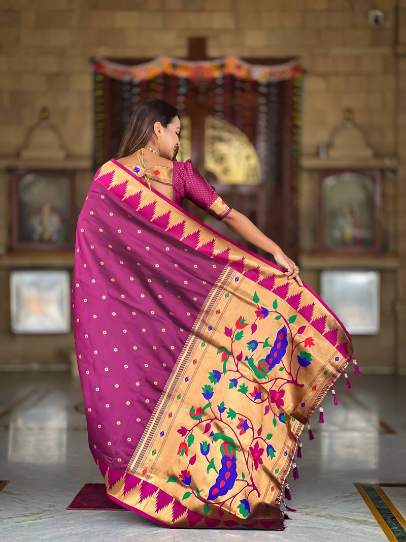 Soft paithani silk saree with zari weawing motifs design and meenakari weawing rich pallu