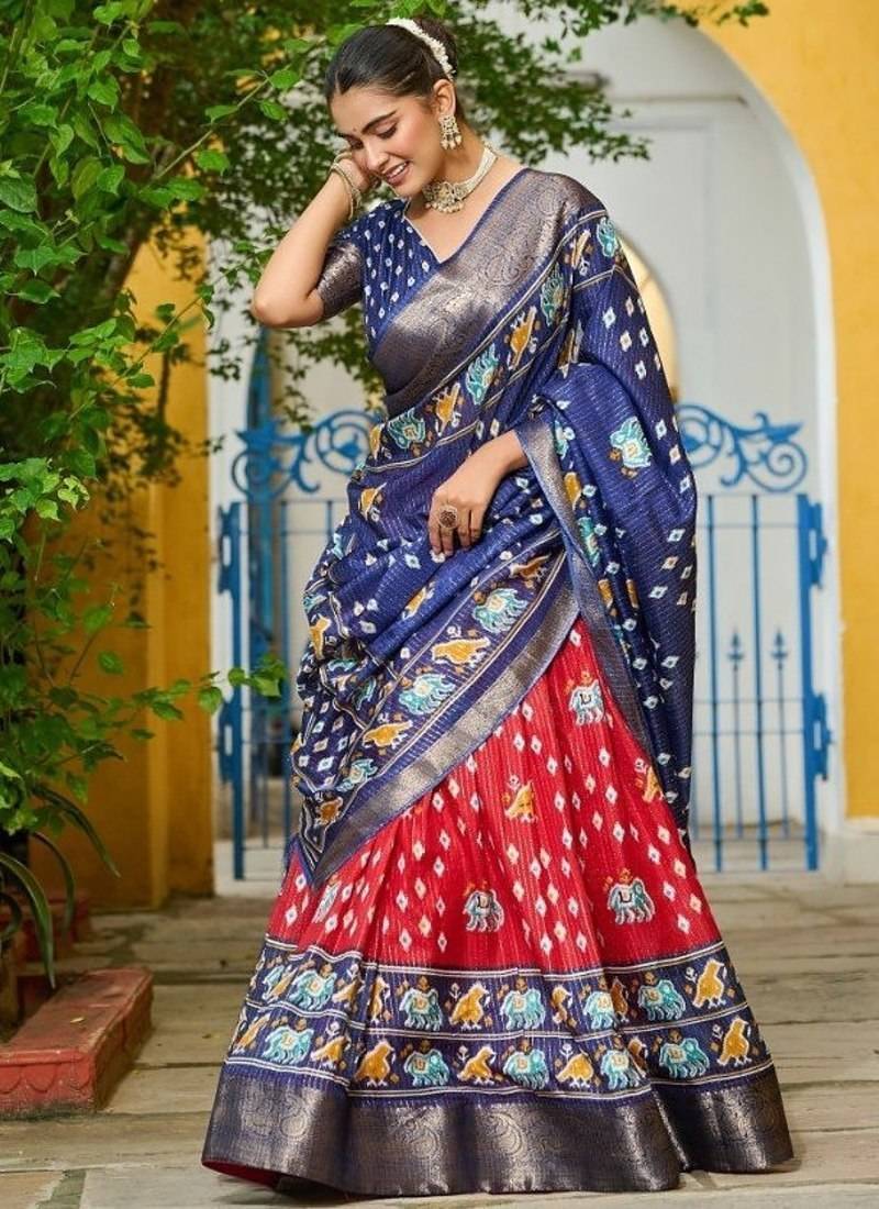 Blue color print work jacquard lehanga choli set