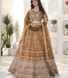Golden color sequins and zari embroidery work net lahenga choli set