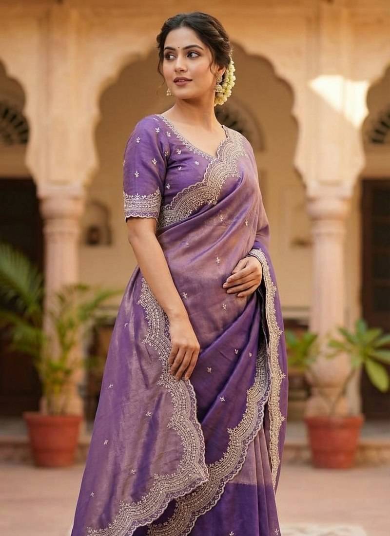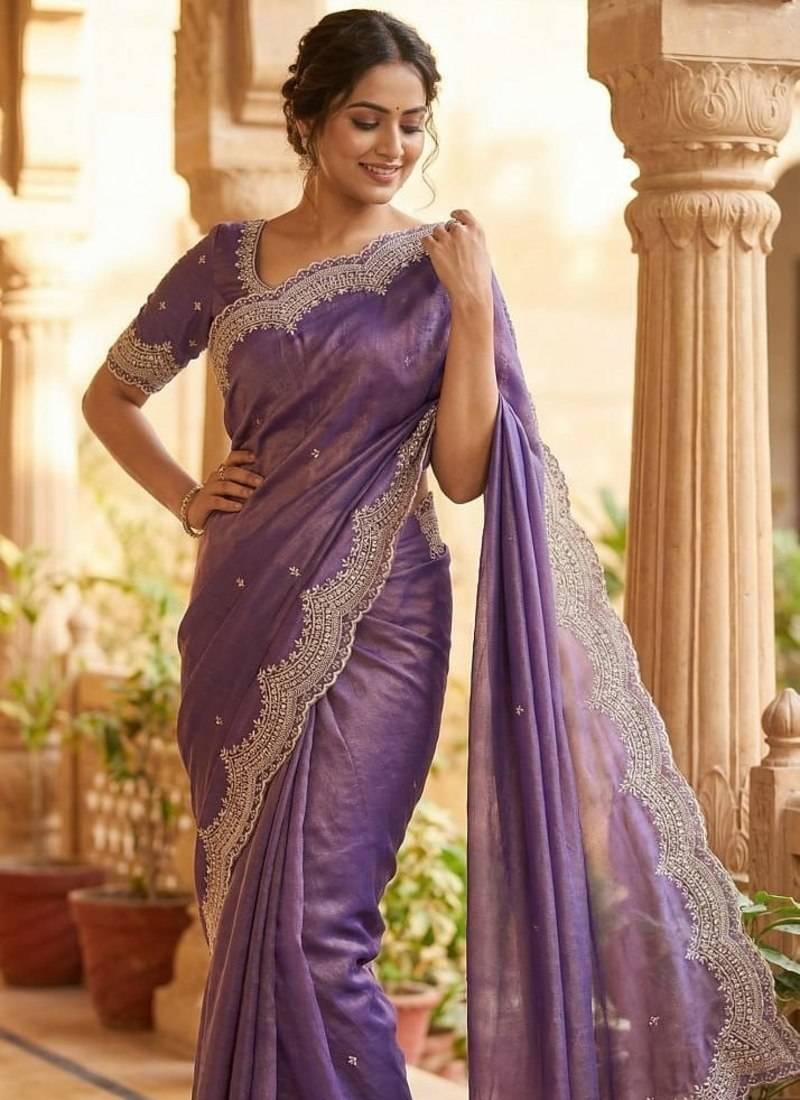 Lavendar color embroidery work with cut work border and havy daimond work silk saree