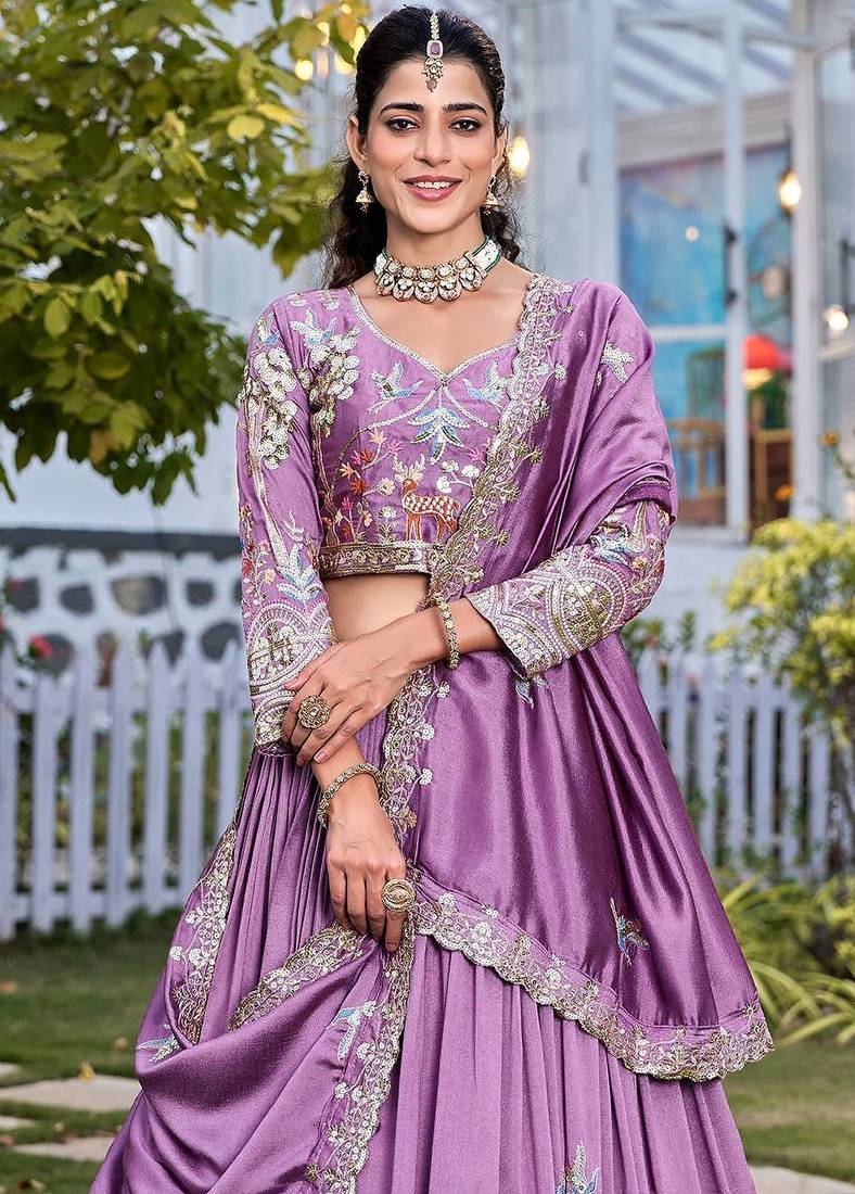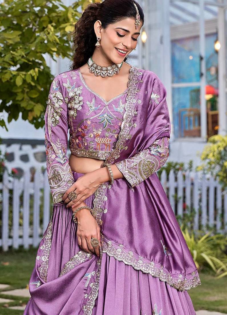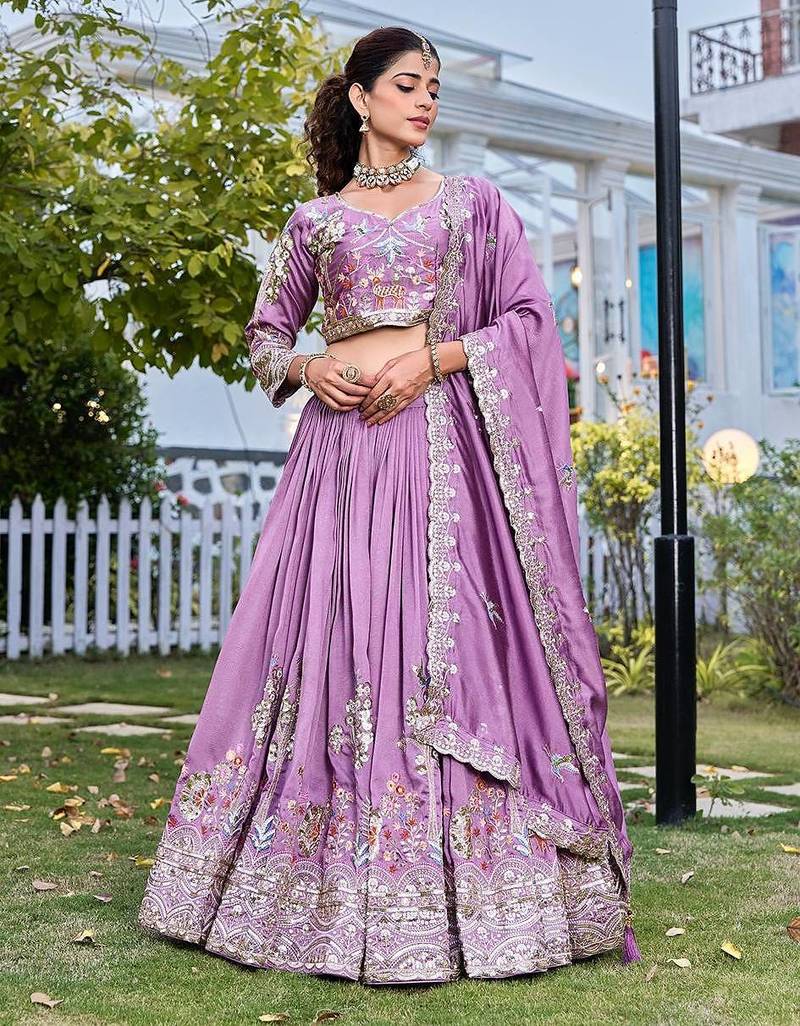 Lavender color embroidery sequence work with thred work silk lahenga choli set