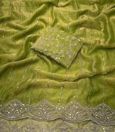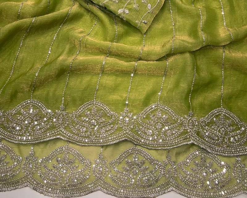 Light olive color sequence embroidery work with cut work border chiffon silk saree