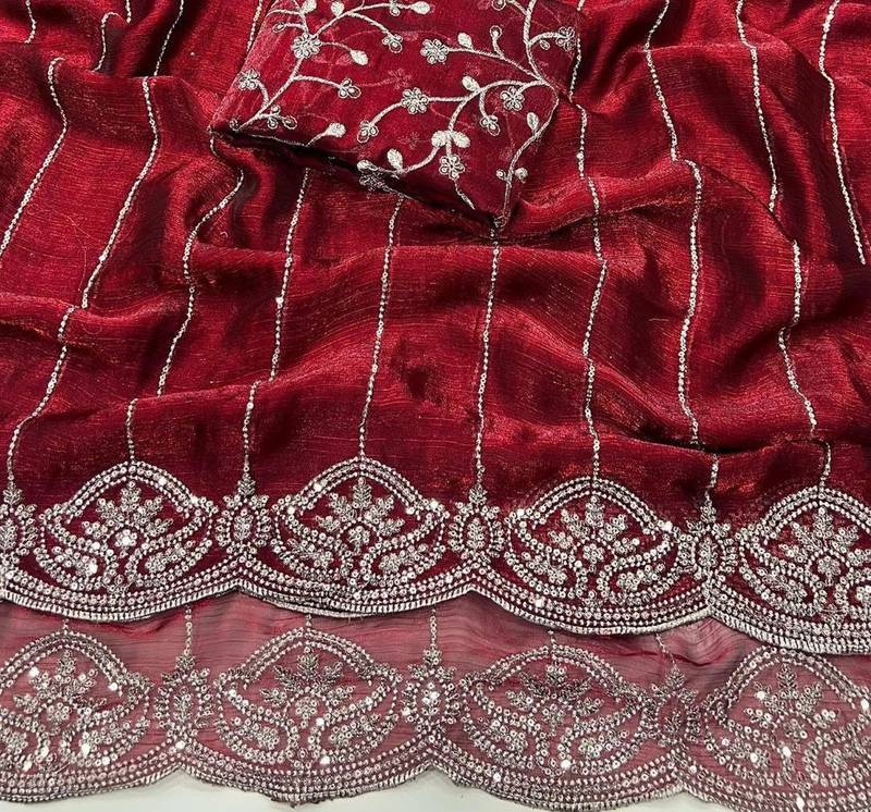 | Product Name | Maroon Color Sequence Embroidery Work With Cut Work Border Chiffon Silk Saree | |