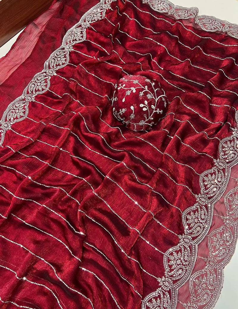 Maroon color sequence embroidery work with cut work border chiffon silk saree