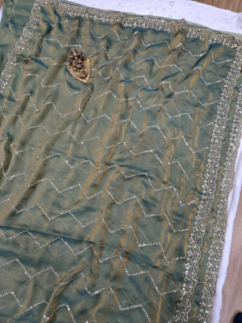 Olive color multi sequincs emrodairy work sattin saree
