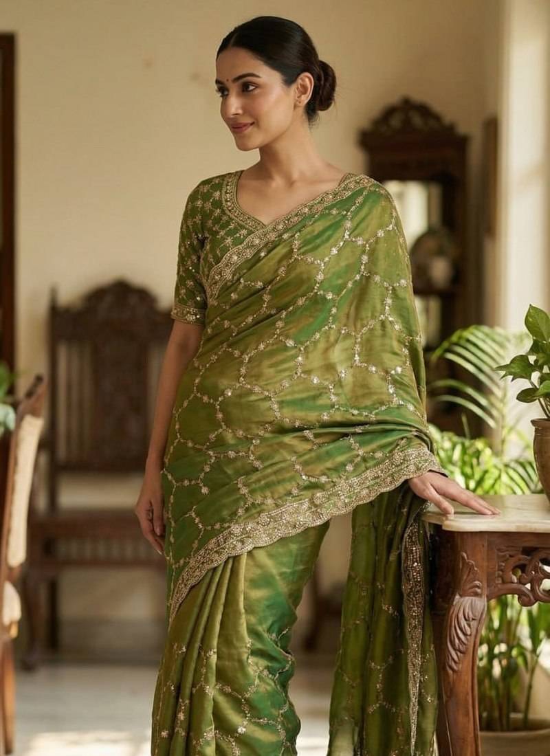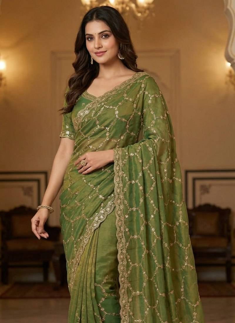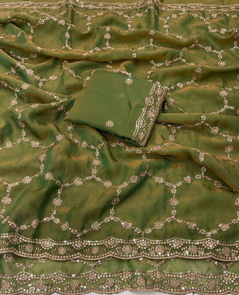 | Product Name | Olive Color Sequence Embroidery Work With Cut Work Border Silk Saree | |