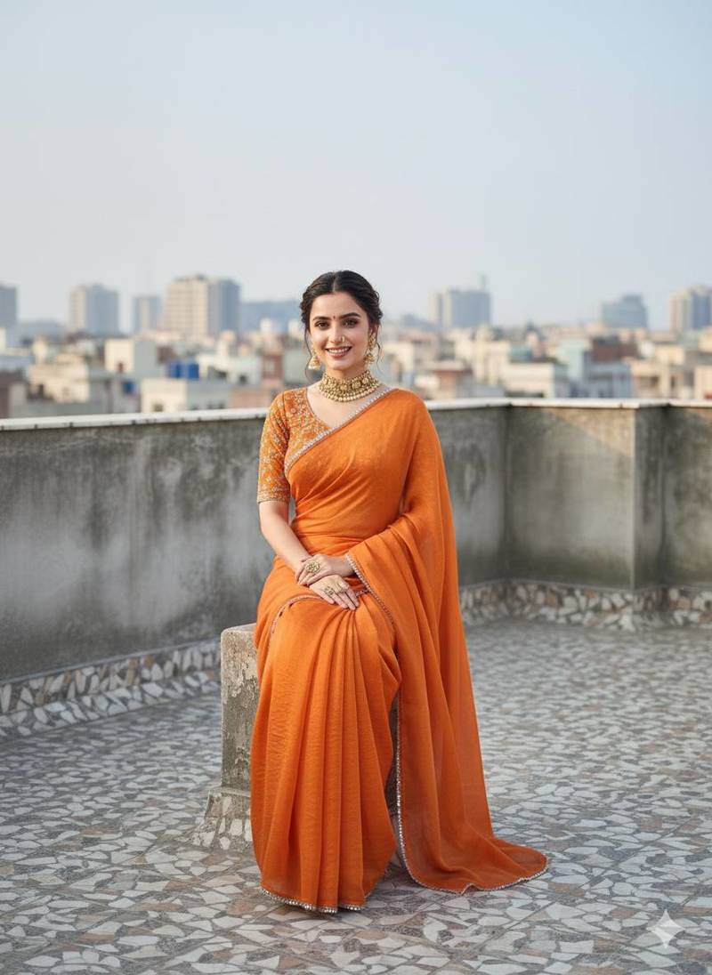 | Product Name | Orange Color Mirror Lace Attched Saree Satin Saree | |