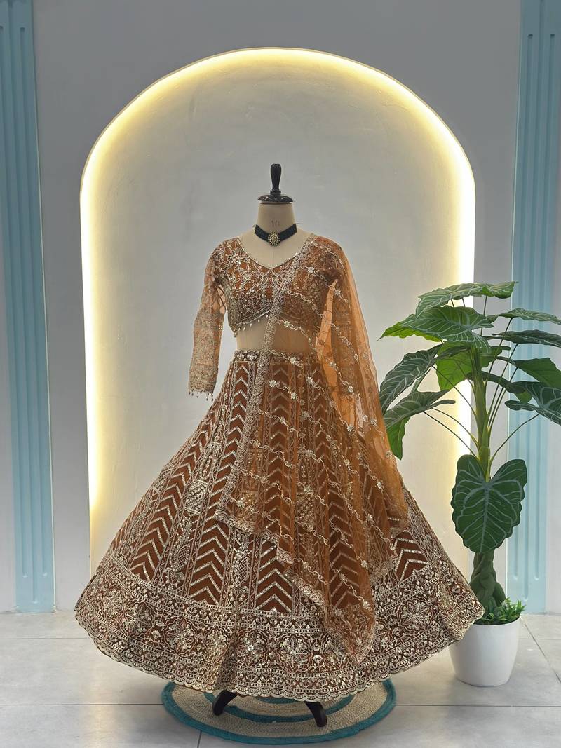 Orange color sequins and codding embroidery work net lahenga choli set
