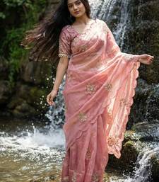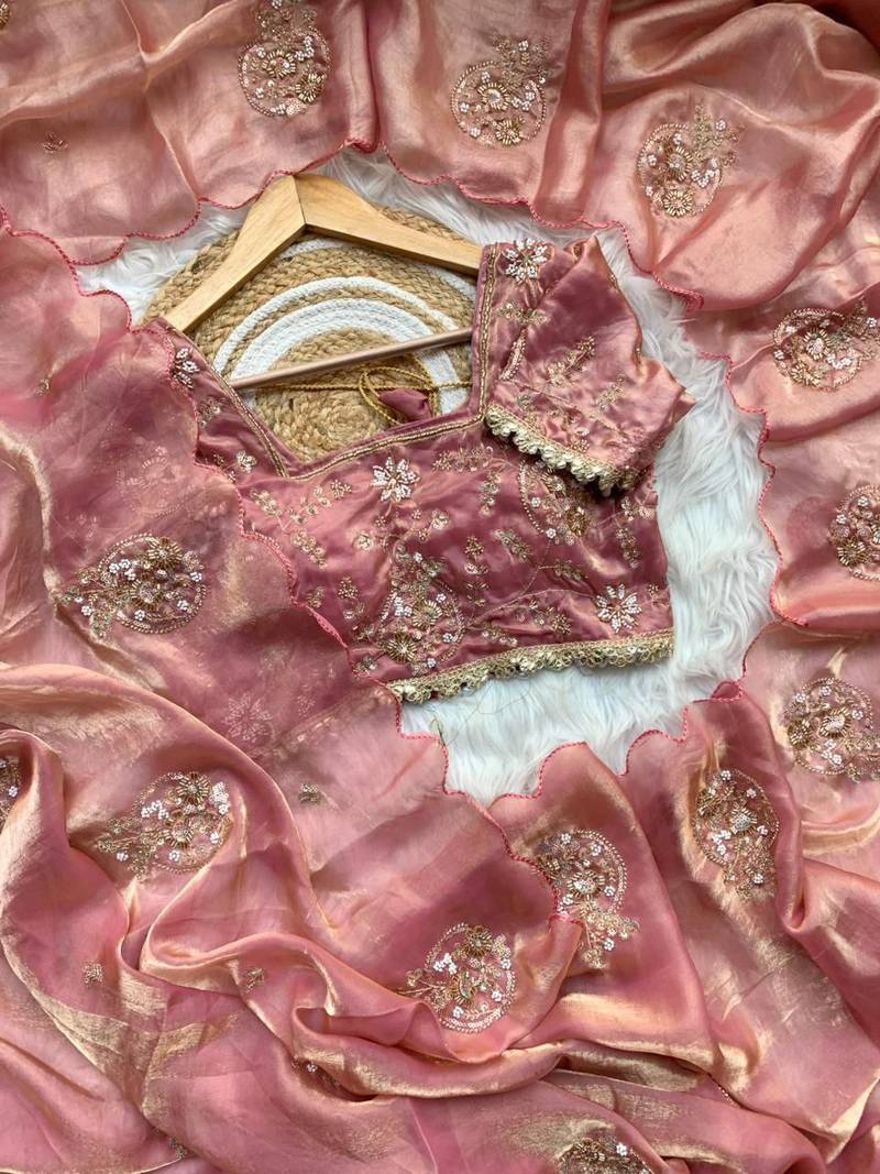 Peach color embroidery beats work silk saree