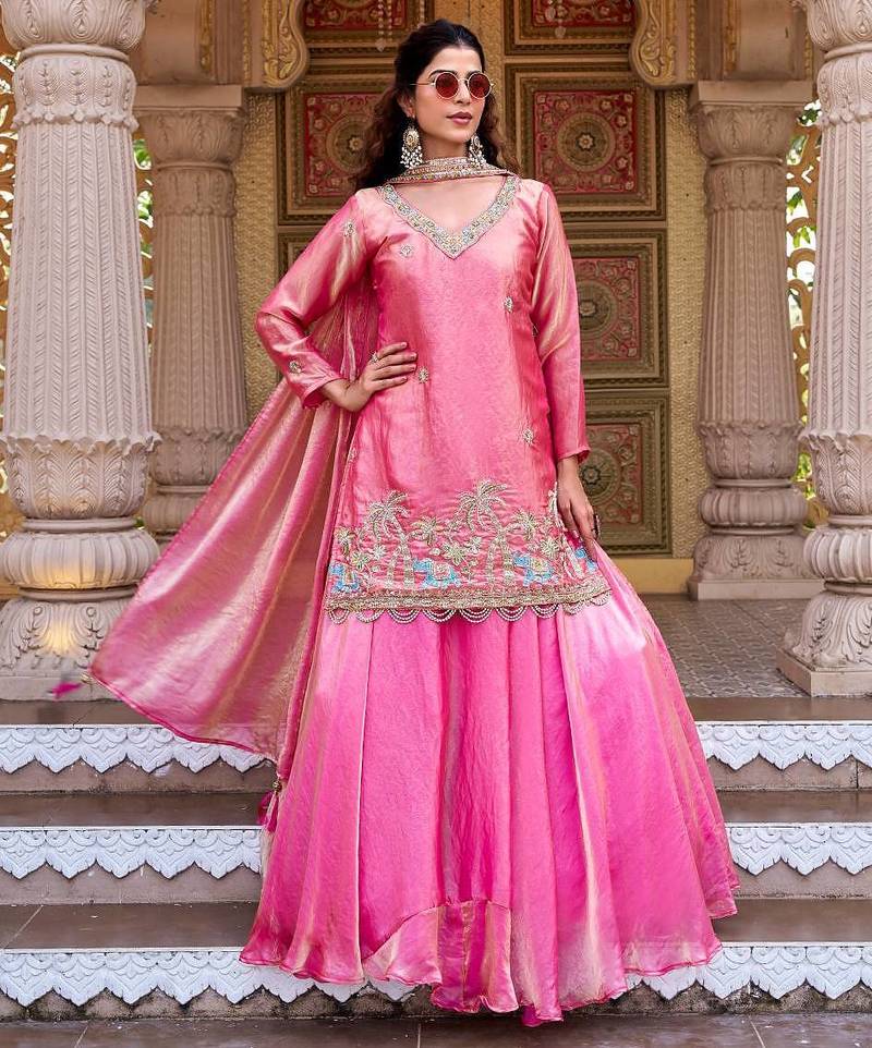 Pink color embroidery bids sequence and thred work silk lahenga choli set