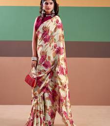 Pink color floral printe satin silk saree
