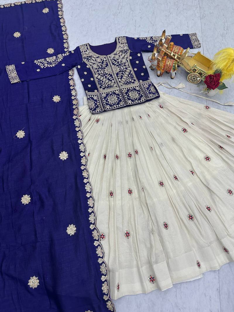 Purple color embroidery sequence and thred work tissue silk lahenga choli set