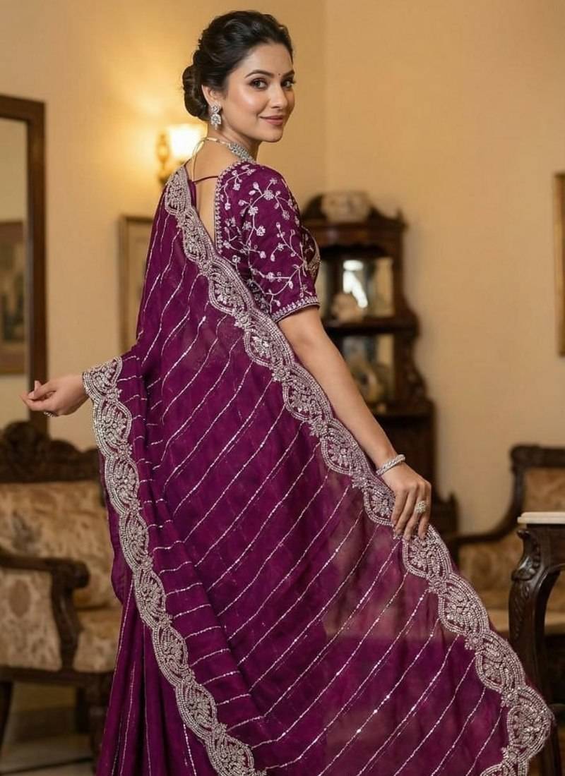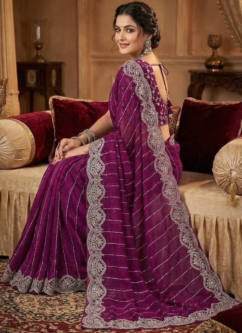 Product Name Purple Color Sequence Embroidery Work With Cut Work Border Chiffon Silk Saree