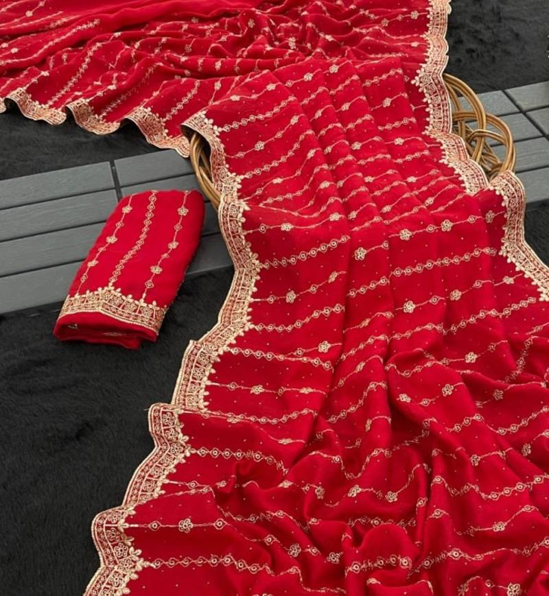 | Product Name | Red Color Zari Work And Stone Work Vichitra Silk Saree | |