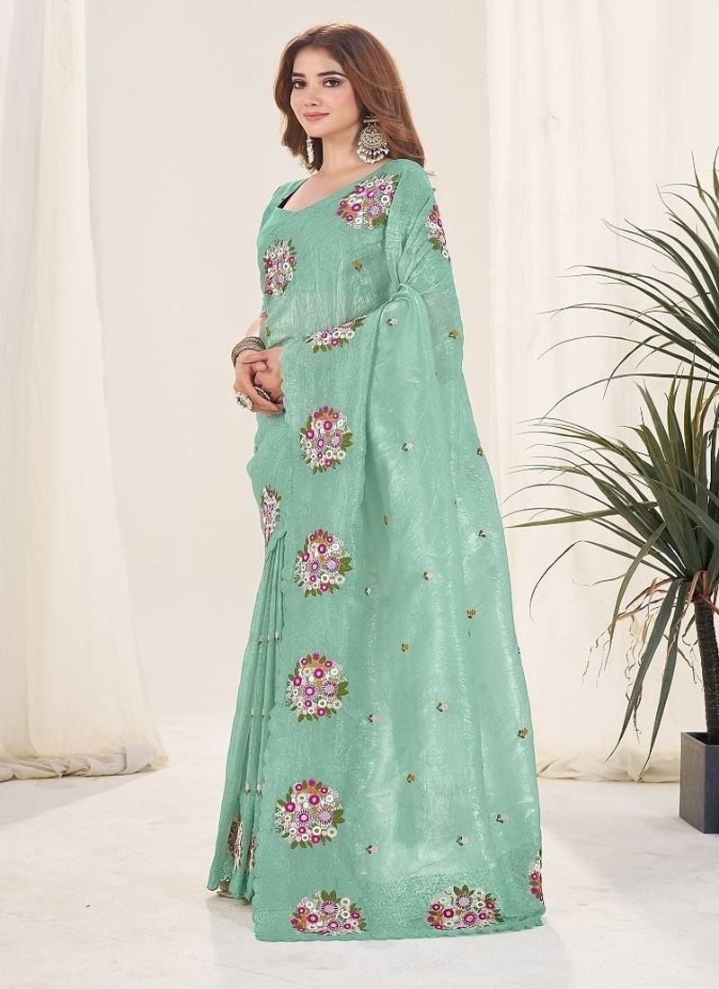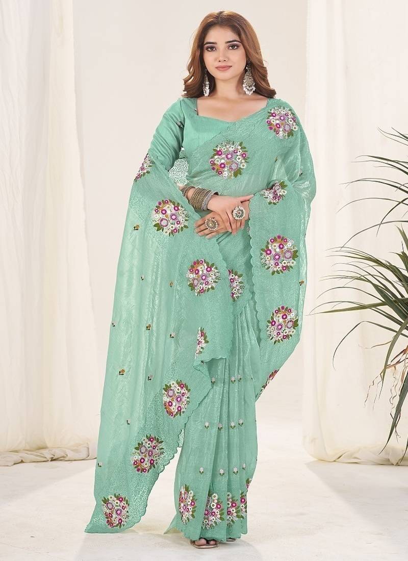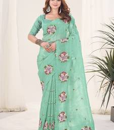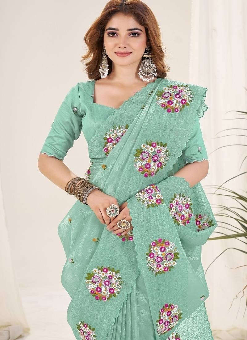 Sea green color thread work silk saree