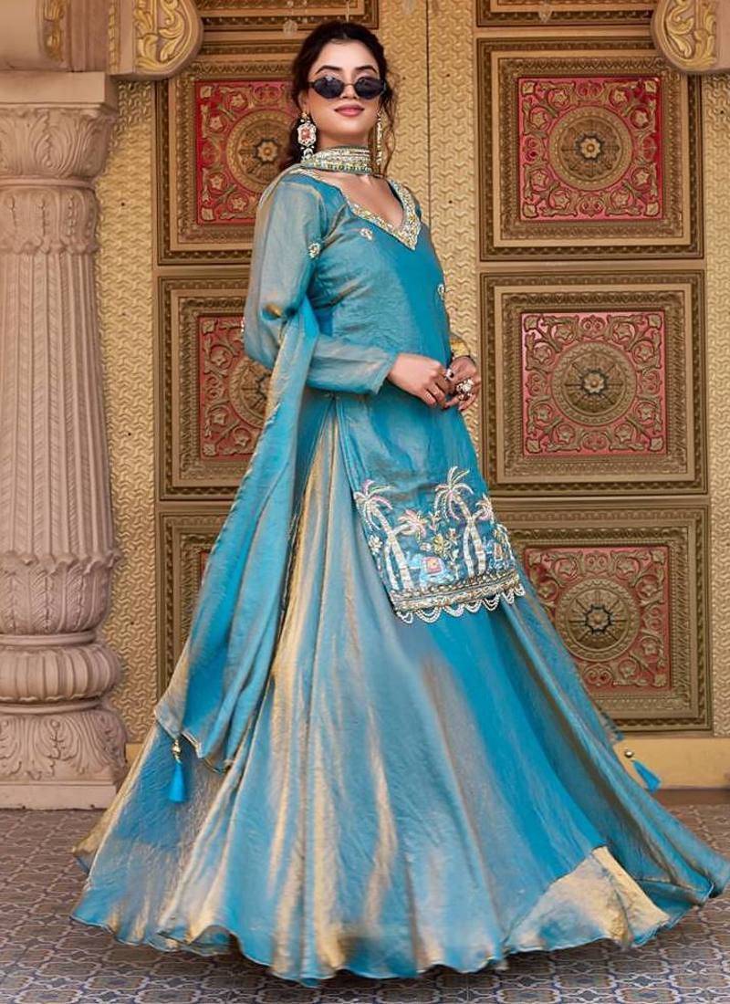 Sky blue color embroidery bids sequence and thred work silk lahenga choli set