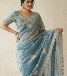 Sky blue color hand work with cut work aarko border sattin silk saree