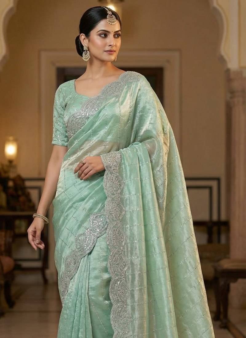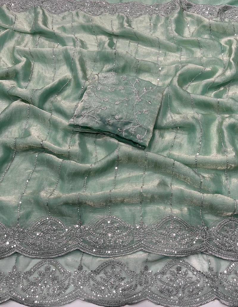 | Product Name | Sky Blue Color Sequence Embroidery Work With Cut Work Border Chiffon Silk Saree | |