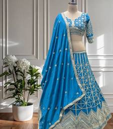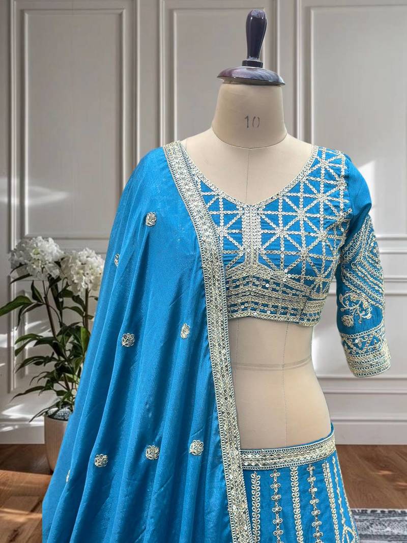 Teal color sequins and codding embroidery work chinon silk lahenga choli set