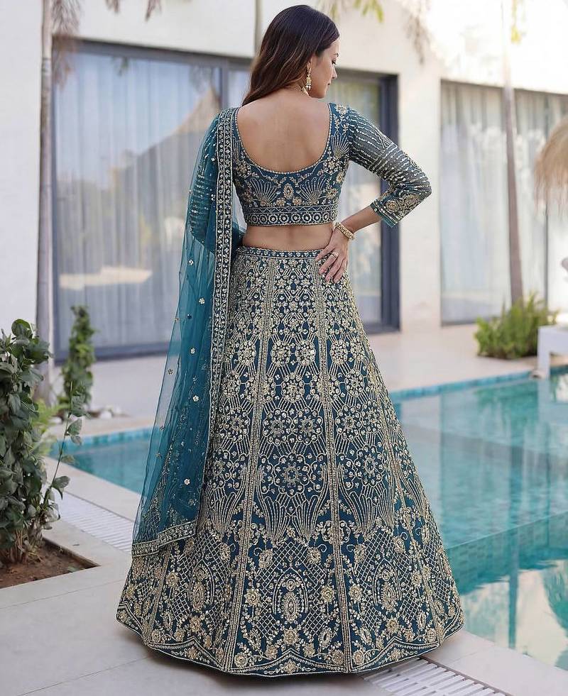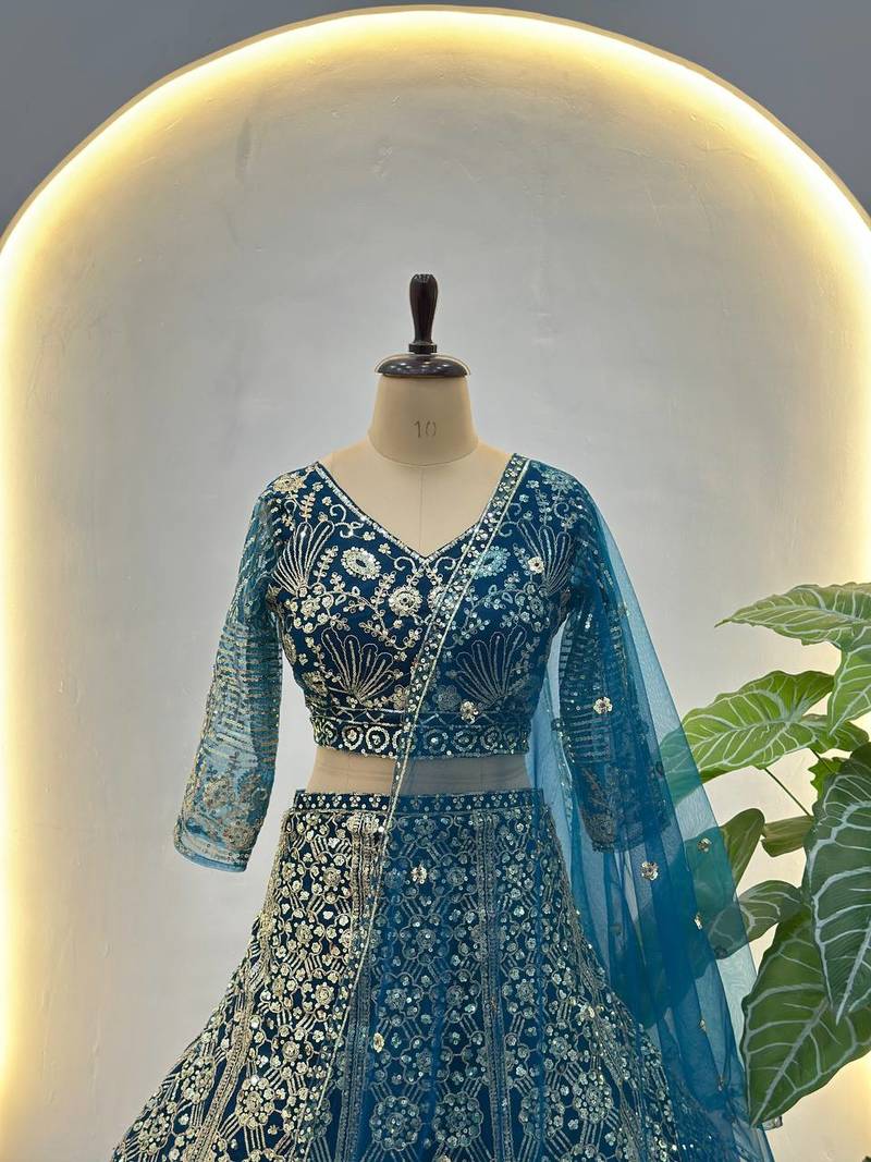 Teal color sequins and codding embroidery work net lahenga choli set