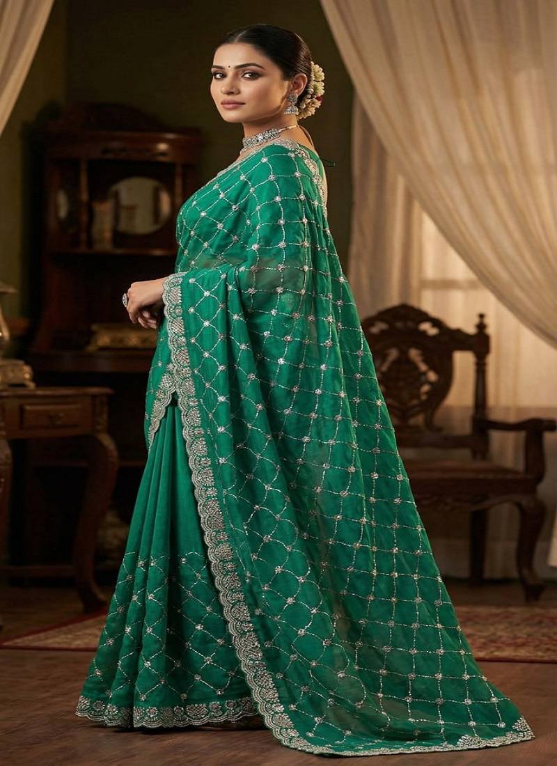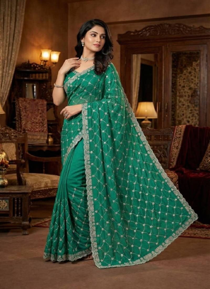 | Product Name | Turquoise Color Sequence Embroidery Work With Cut Work Border Chiffon Silk Saree | |