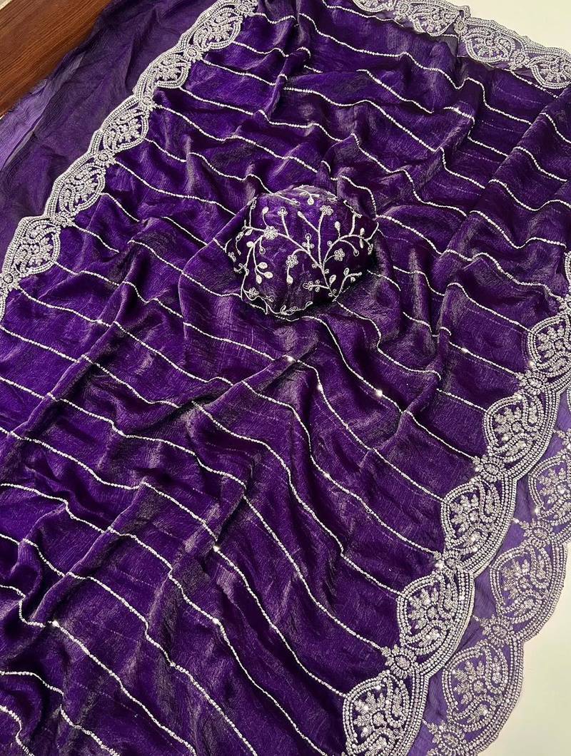 Product Name Violet Color Sequence Embroidery Work With Cut Work Border Chiffon Silk Saree