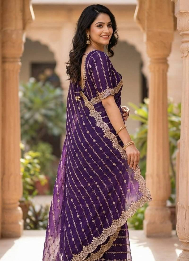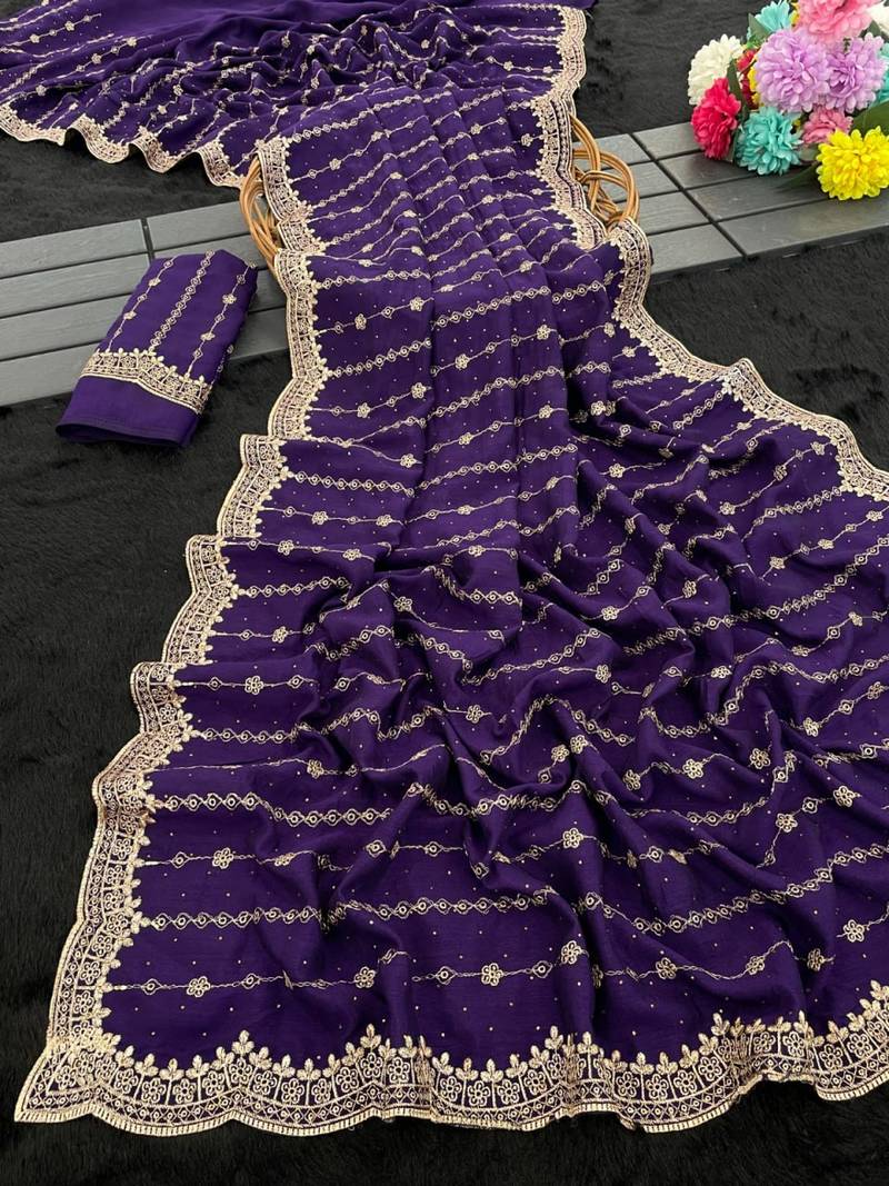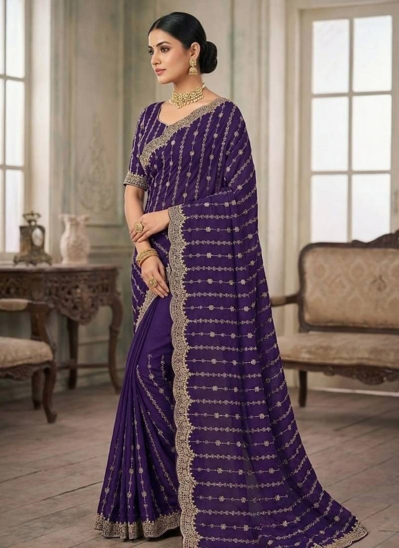 Violet Color Zari Work And Stone Work  Vichitra silk Saree