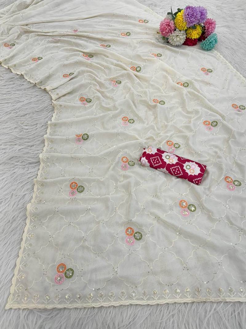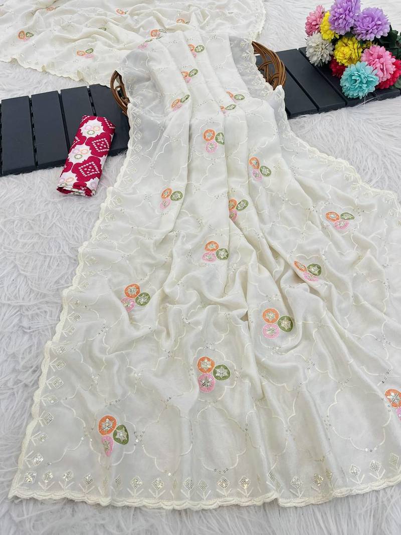 White color embroidery work and multi thread work with arco cut work border vichitra silk saree