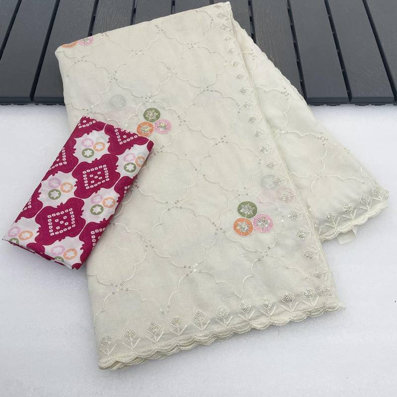 Product Name White Color Embroidery Work And Multi Thread Work With Arco Cut Work Border Vichitra Silk Saree