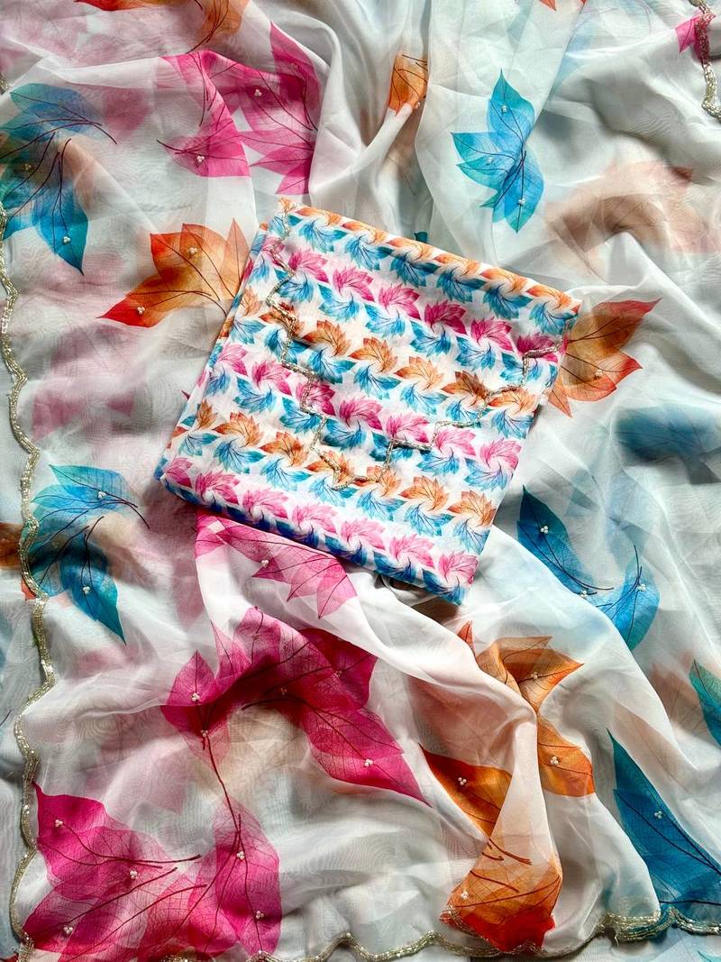 | Product Description | Soft Tabi Organza Cool Flower Print Along With Silver Cut Dana Cut Work With Moti Work